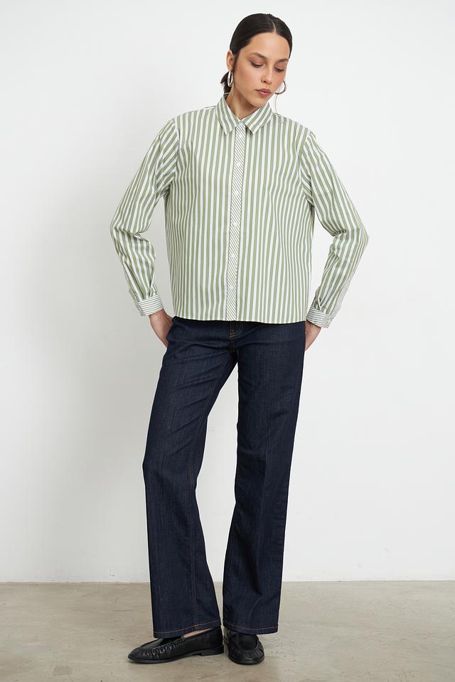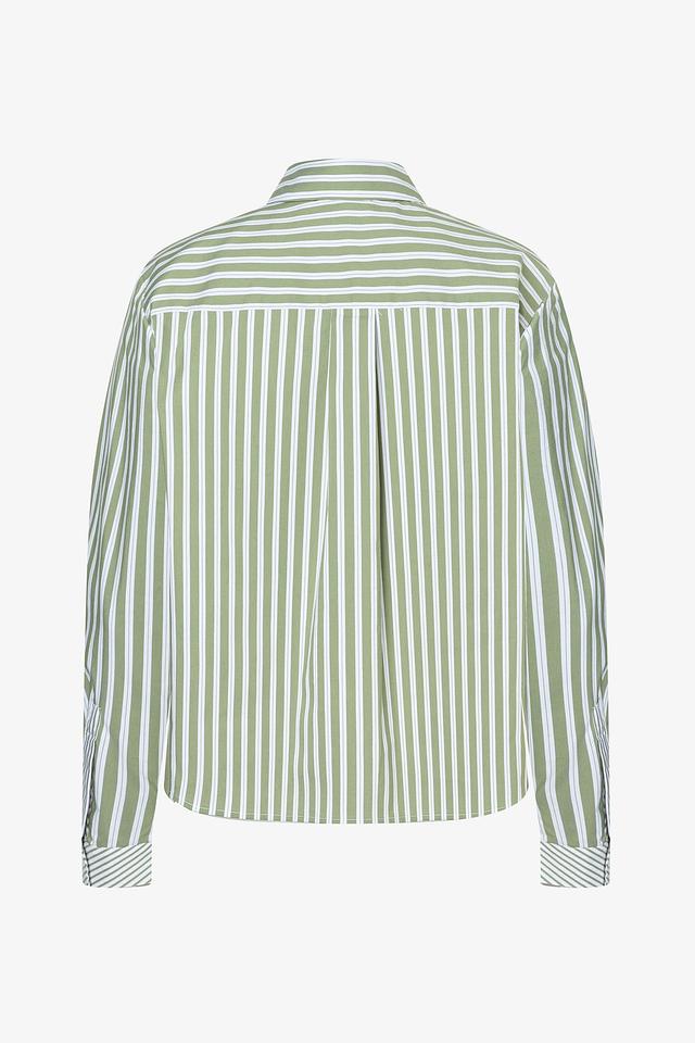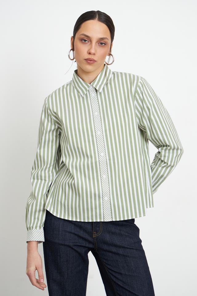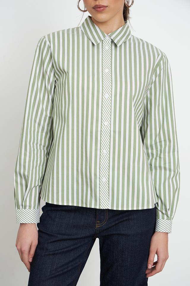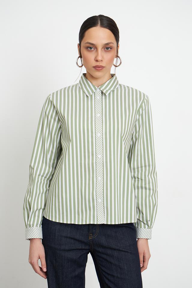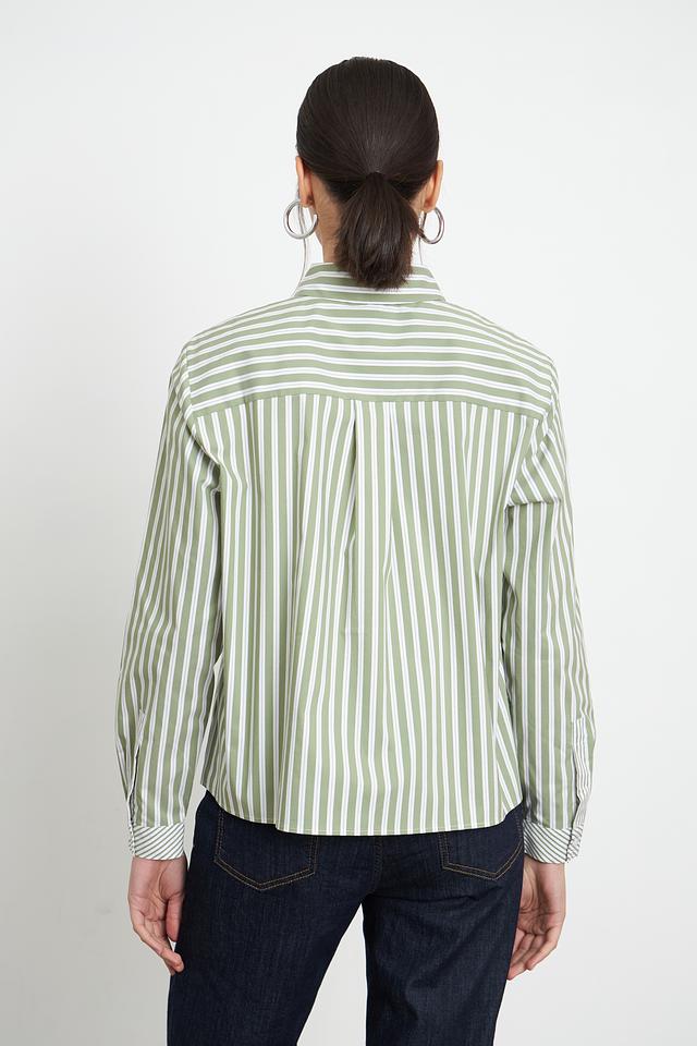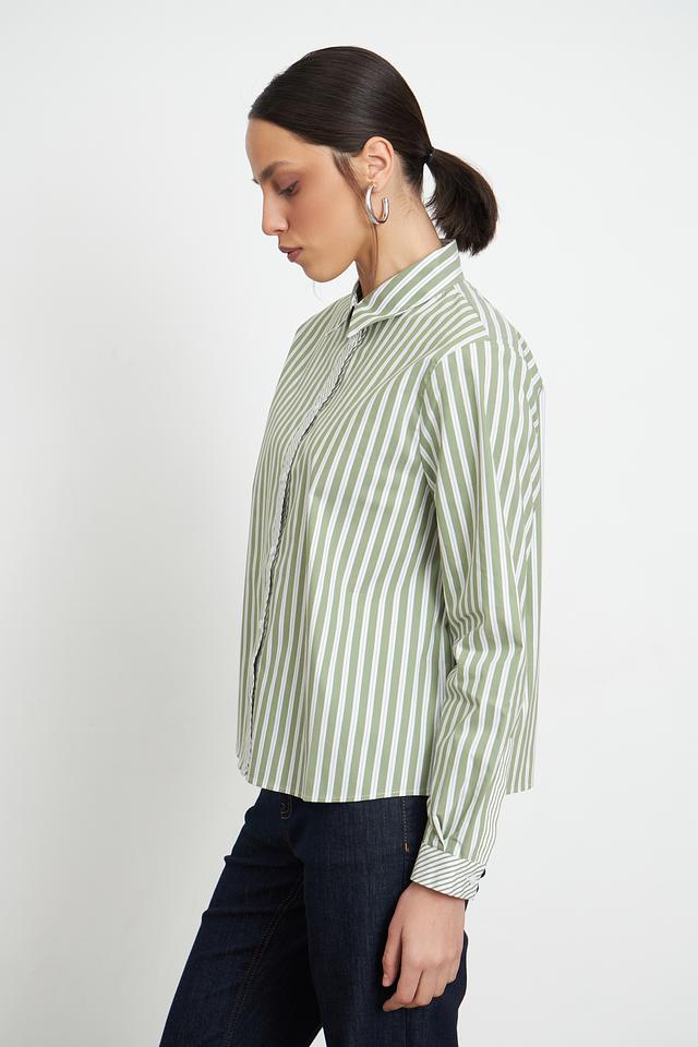 Основной цвет блузы – зеленый, с чередованием белых полос. Такой принт универсален и легко сочетается с различными элементами одежды. Блуза идеально подойдет для создания как повседневных, так и более формальных образов.