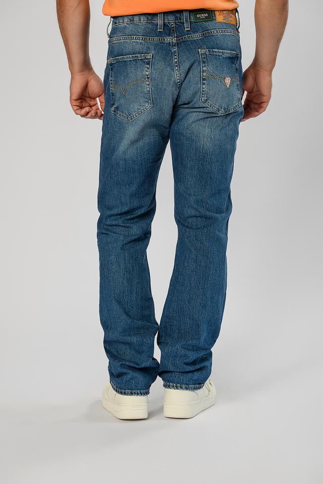 Мужские джинсы Guess синего цвета — это классический выбор для повседневного образа. Прямой крой и эффект потертости придают им стильный и непринужденный вид. Изготовлены из качественного хлопка с добавлением эластана для комфорта. Состав: хлопок 99%, эластан 1%
