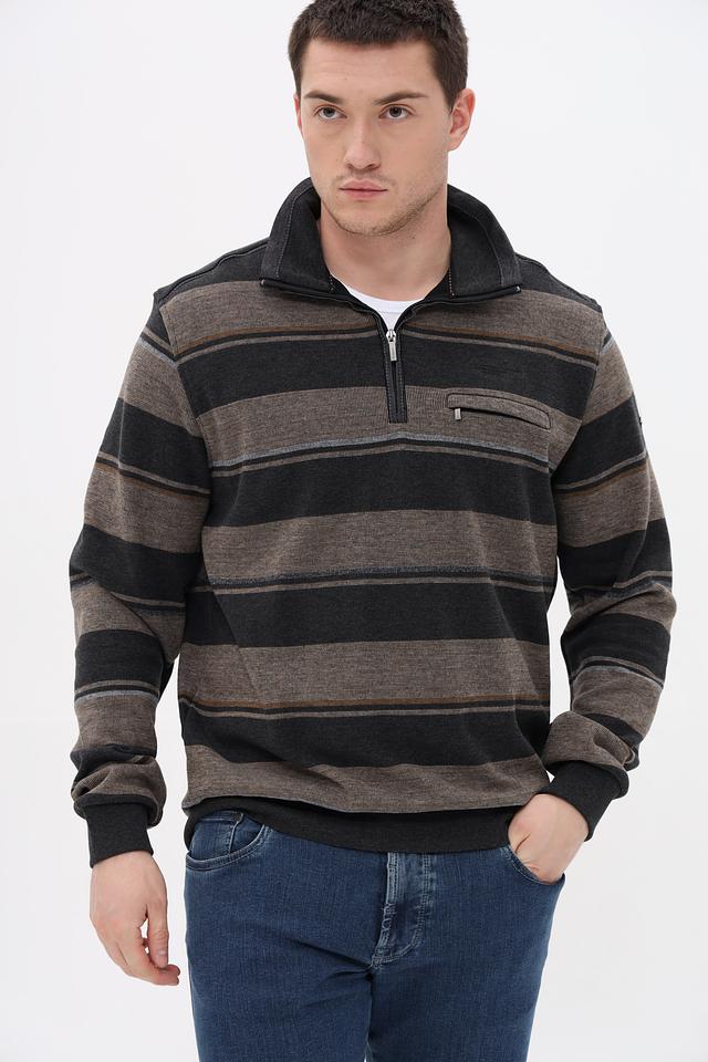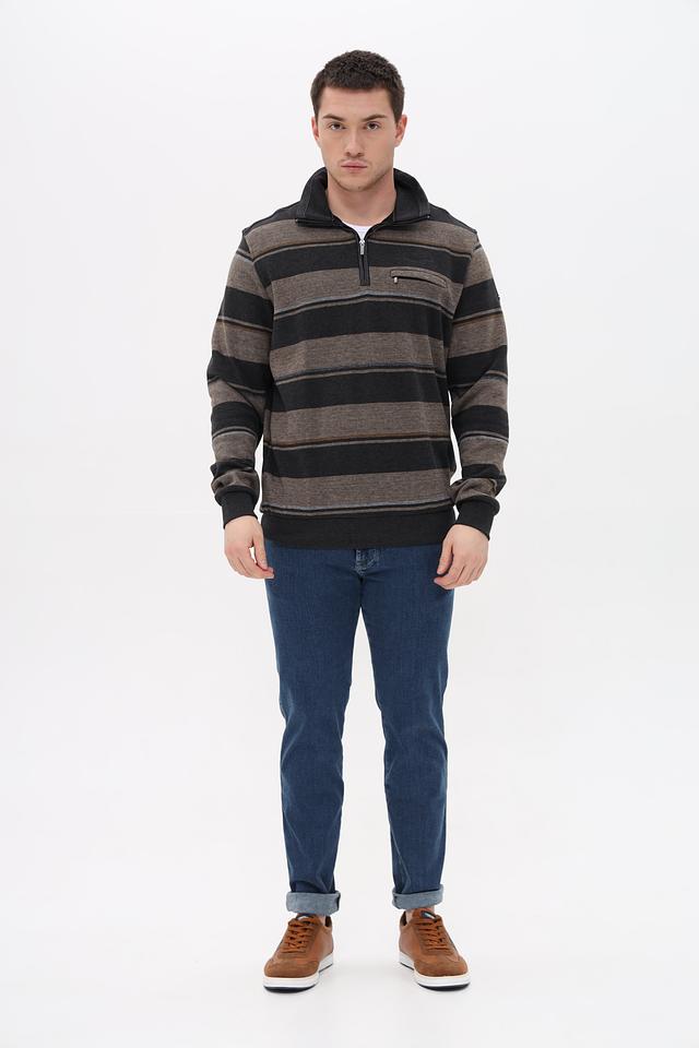 Мужской джемпер Monte Carlo серого цвета с полосатым узором и воротником-стойкой. Изготовлен из 100% хлопка, обеспечивающего комфорт и удобство в носке. Модель дополнена функционарной молнией и накладным карманом. Состав: хлопок 100%