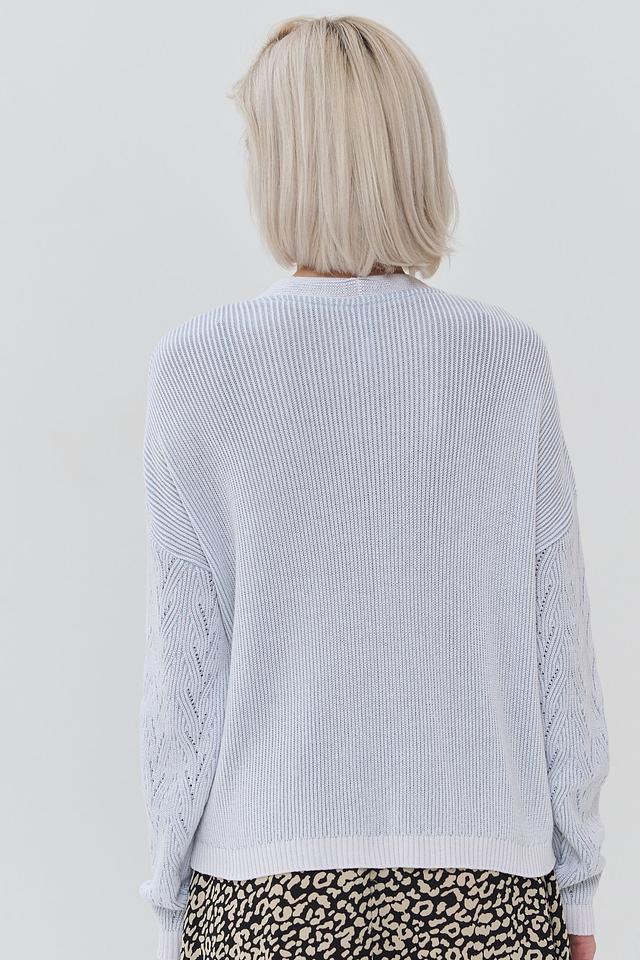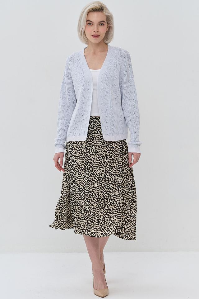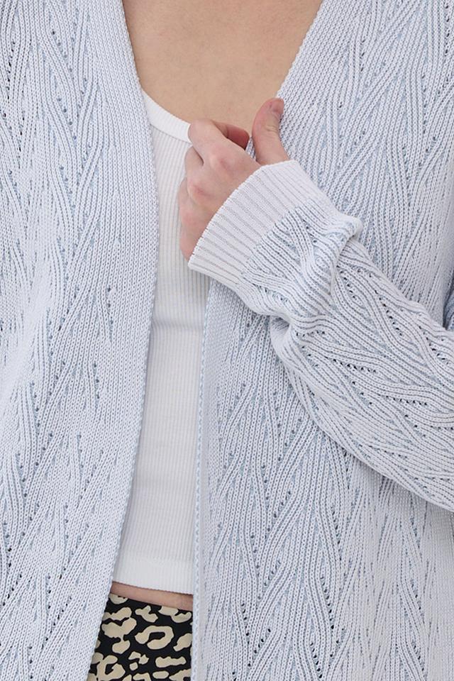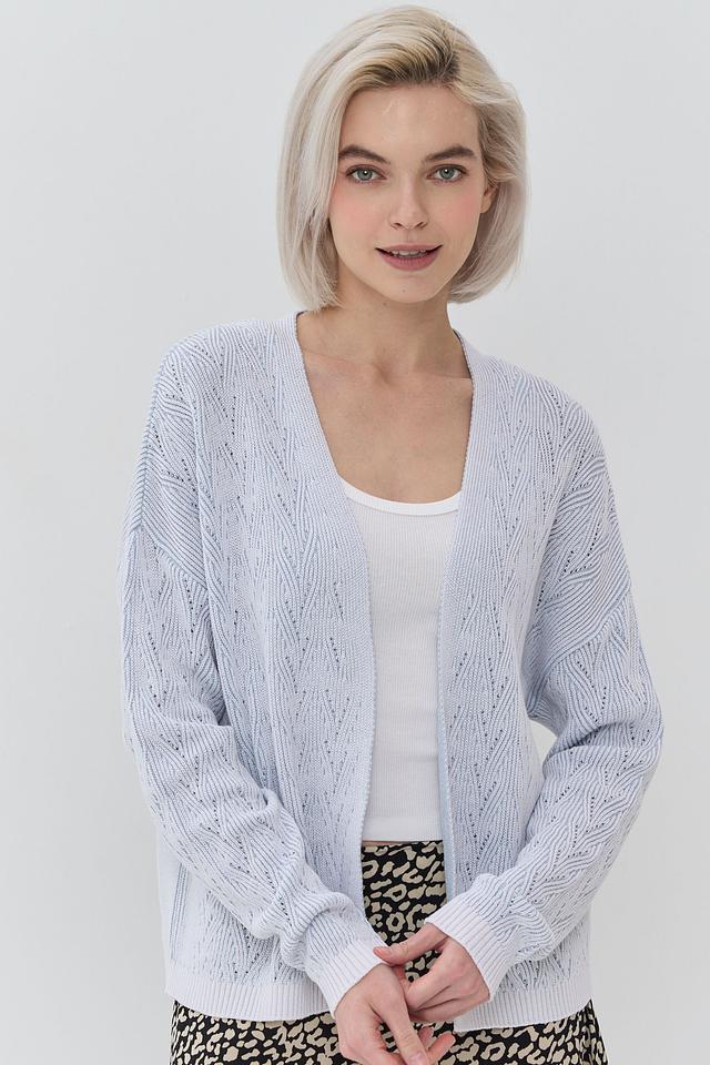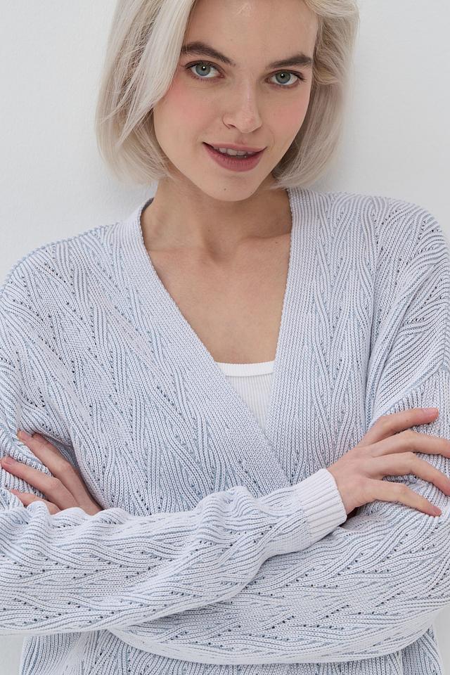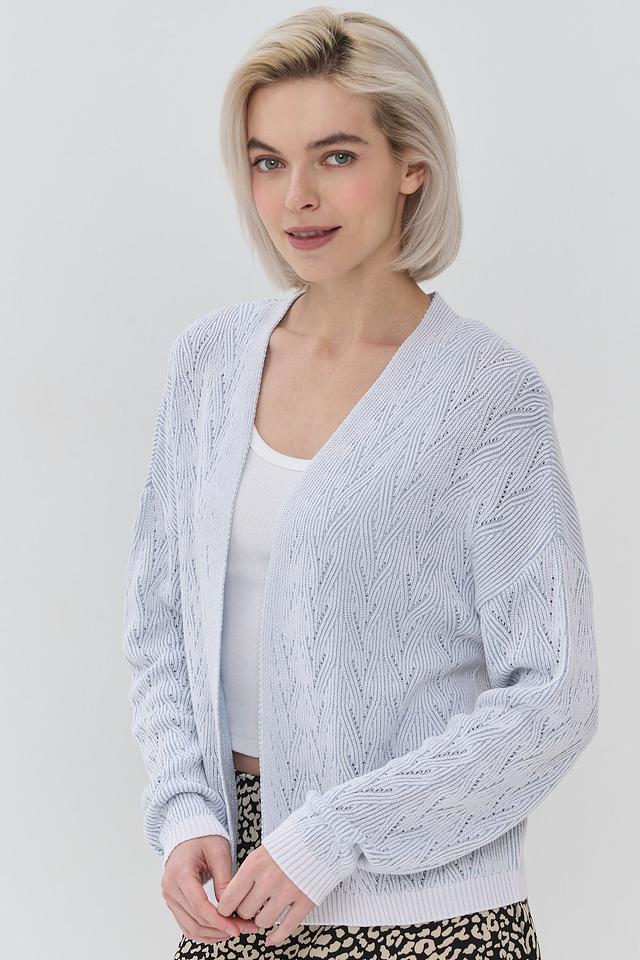 Женский кардиган NEWVAY голубого цвета выполнен из мягкого вязаного полотна с ажурным узором. Модель имеет V-образный вырез и длинные рукава, идеально подходит для создания уютных и стильных образов. Состав: хлопок 50%, пан 50%