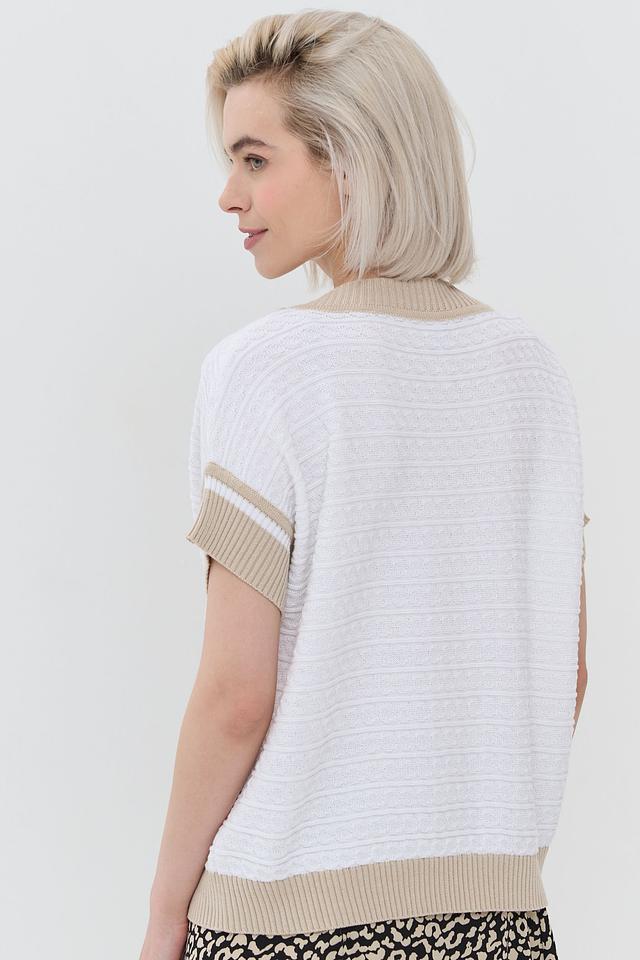 Белый джемпер NEWVAY с коротким рукавом и бежевой полоской на горловине и рукавах. Модель выполнена из мягкого и приятного к телу трикотажа, идеально подходит для создания повседневных образов. Состав: хлопок 50%, пан 50%