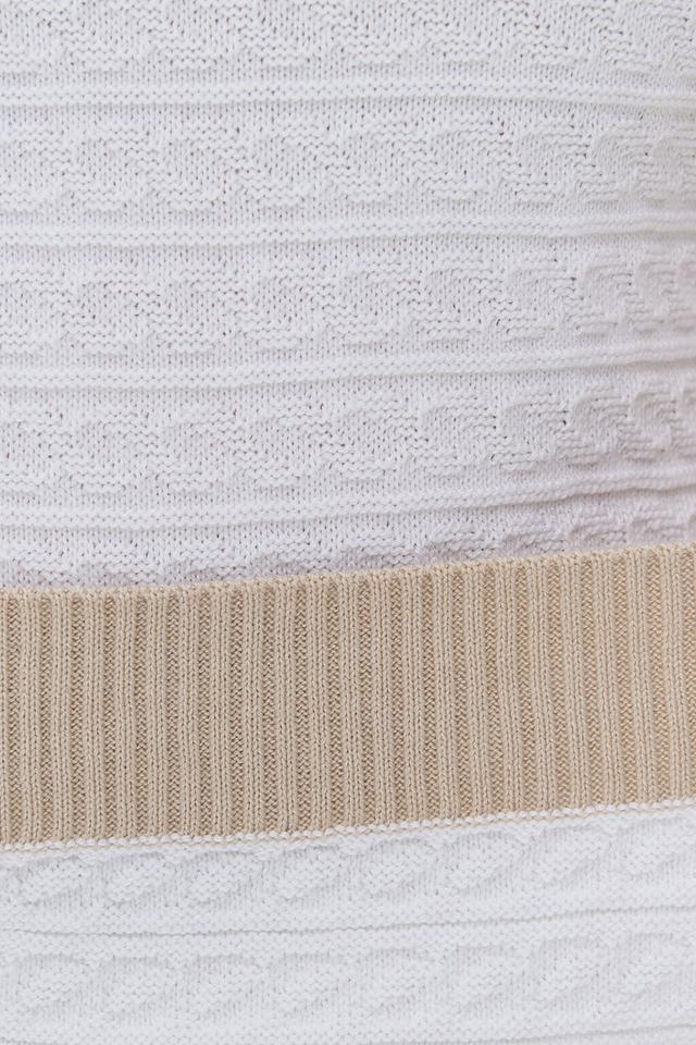 Этот стильный джемпер от NEWVAY станет отличным дополнением к вашему гардеробу. Выполненный в белом цвете, он имеет короткий рукав и аккуратную круглую горловину. Контрастная бежевая полоска на горловине и рукавах добавляет модели изысканности и оригинальности.