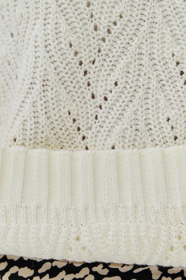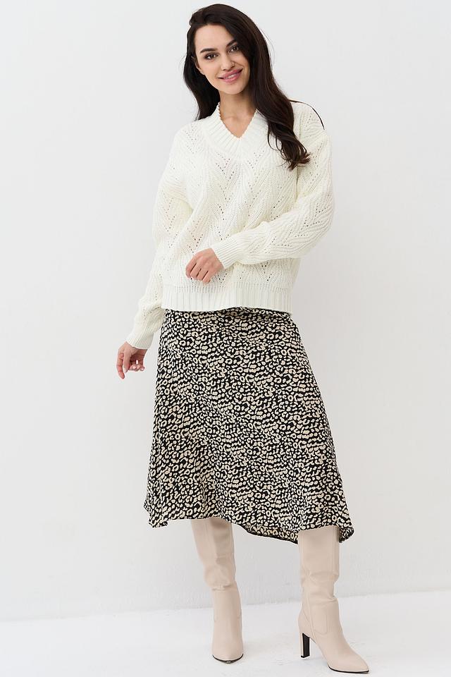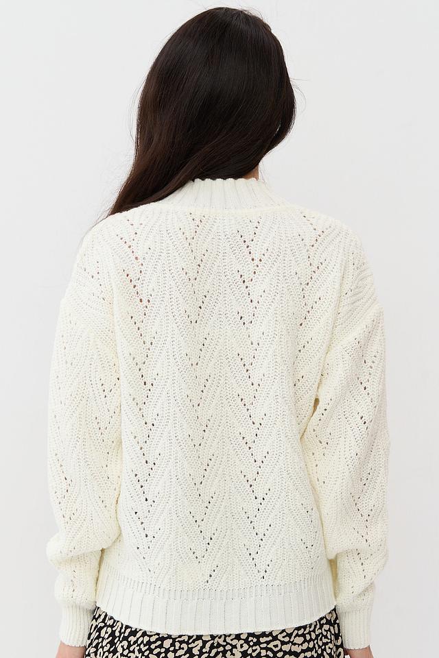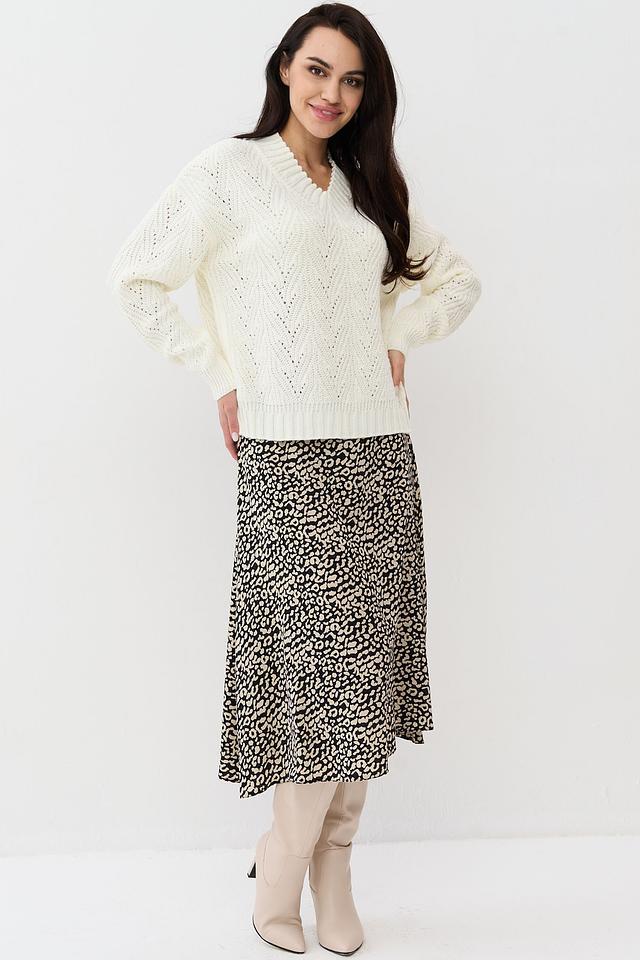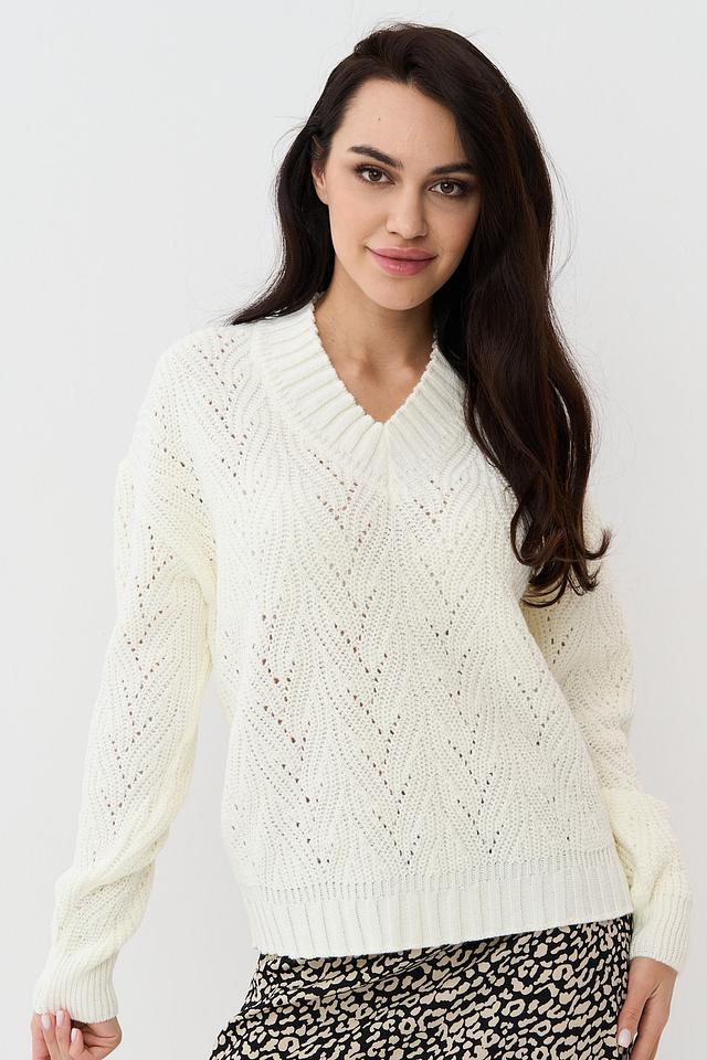 Женский джемпер NEWVAY молочного цвета с V-образным вырезом и ажурной вязкой. Модель выполнена из мягкого трикотажа с добавлением шерсти, что обеспечивает комфорт и тепло. Идеально сочетается с юбками и брюками. Состав: пан 70%, шерсть 30%