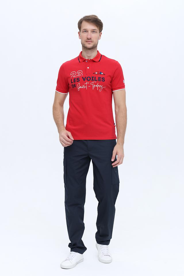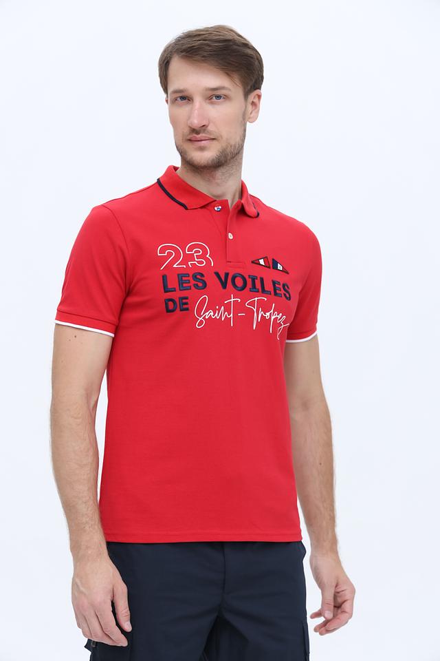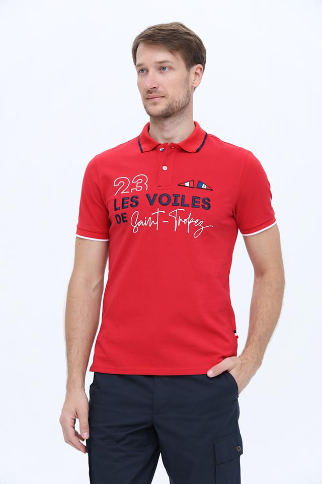 Модель имеет классический крой, короткие рукава и воротник-поло с контрастной синей окантовкой. На груди расположена эффектная графика с логотипом бренда и надписью "23 LES VOILES DE SAINT-TROPEZ".