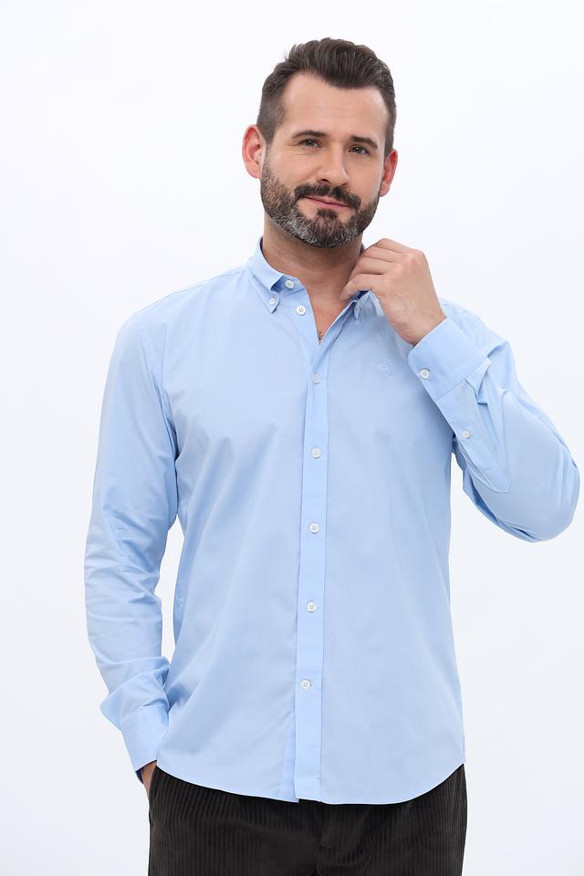 Рубашка имеет классический крой с длинными рукавами и воротником button-down. Изготовлена из качественного хлопка (97%) с добавлением эластана (3%), что обеспечивает комфорт при носке и сохранение формы.