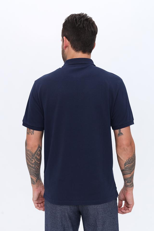 Поло имеет тёмно-синий цвет, который легко сочетается с различными элементами гардероба. На груди расположена фирменная эмблема бренда, выполненная в виде логотипа на фоне округлой нашивки. Воротник и планка с тремя пуговицами выполнены из рибаны, что придает поло аккуратный и завершенный вид.