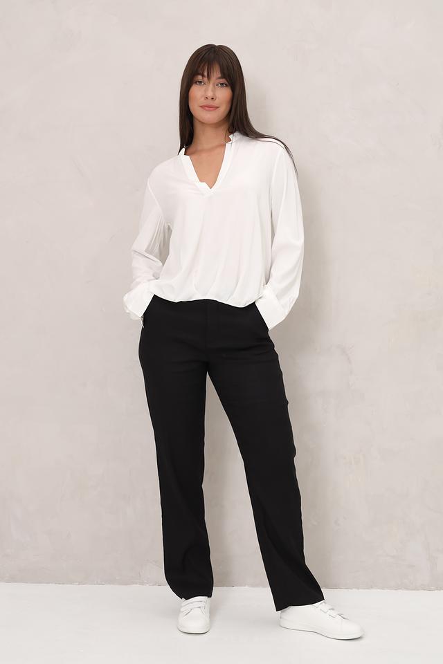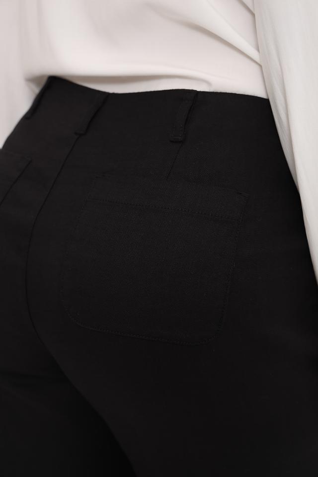 Брюки изготовлены из высококачественной смеси льна (53%) и вискозы (45%) с добавлением эластана (2%), что обеспечивает комфорт в носке и лёгкость ухода. Ткань приятна к телу и хорошо держит форму.