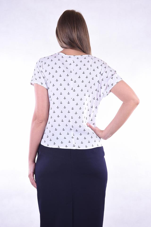 Блуза имеет короткие рукава и классический крой, который подходит для различных типов фигур. Её украшает милый принт в виде якорей, который придаёт ей морской стиль и лёгкость.