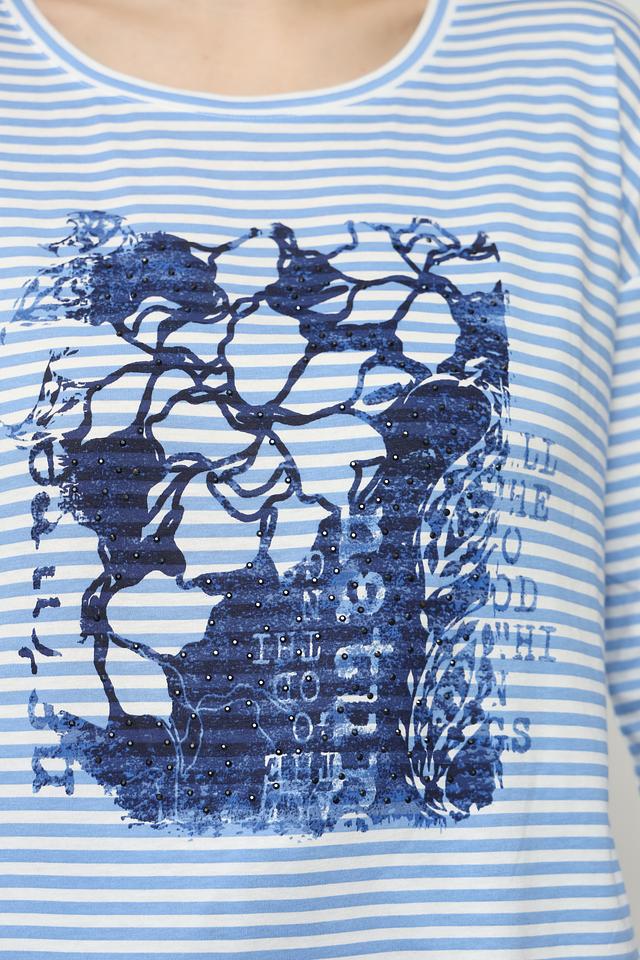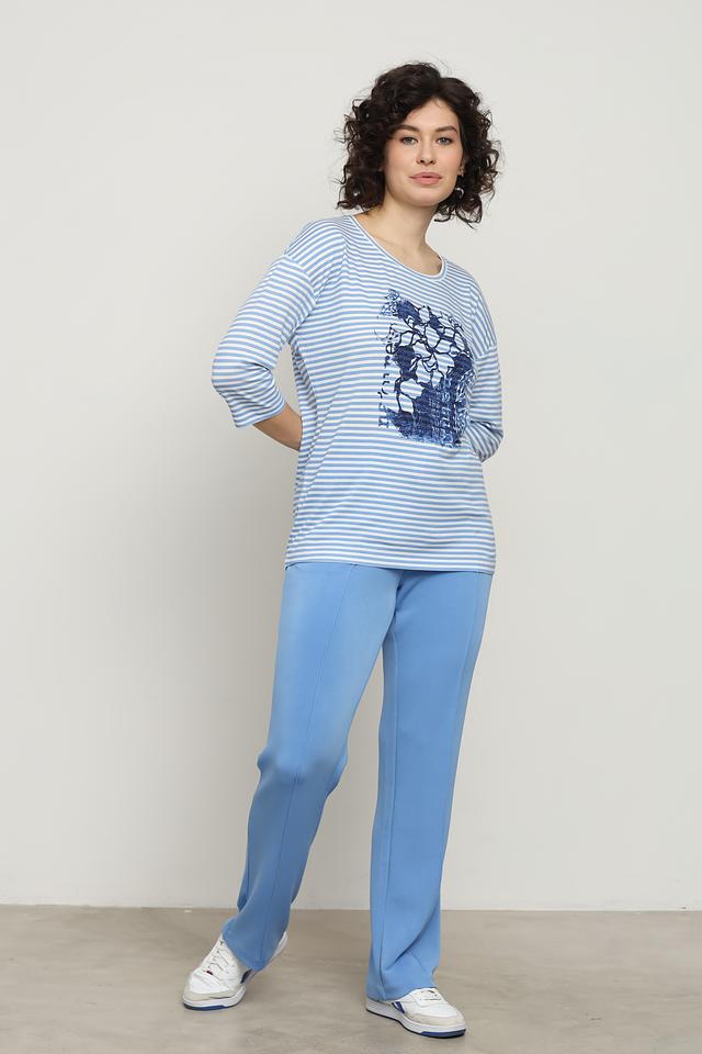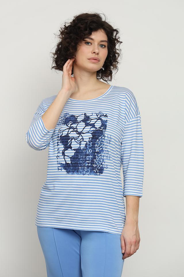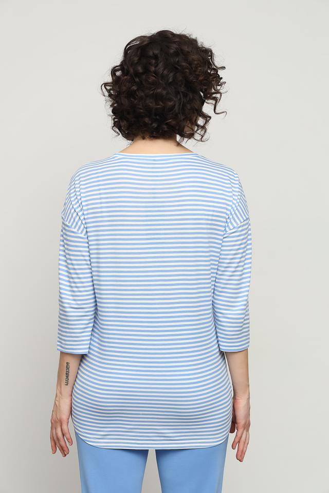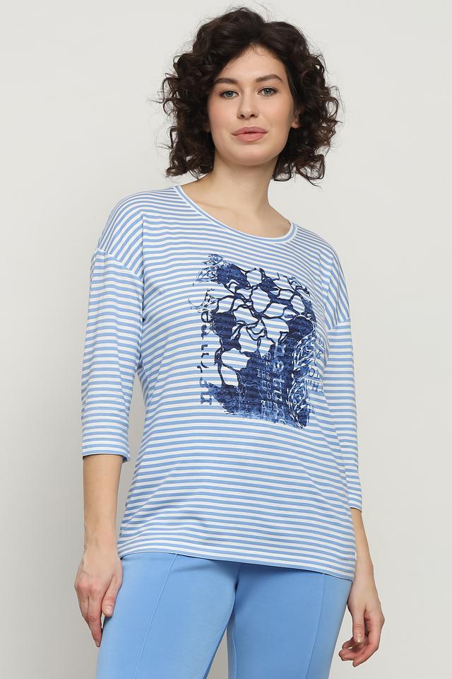 Лонгслив имеет классический крой с округлым вырезом горловины и рукавом 3/4. Основной цвет – голубой, дополненный белыми полосками. Привлекает внимание оригинальный принт с изображением черепа, выполненный в синих тонах.