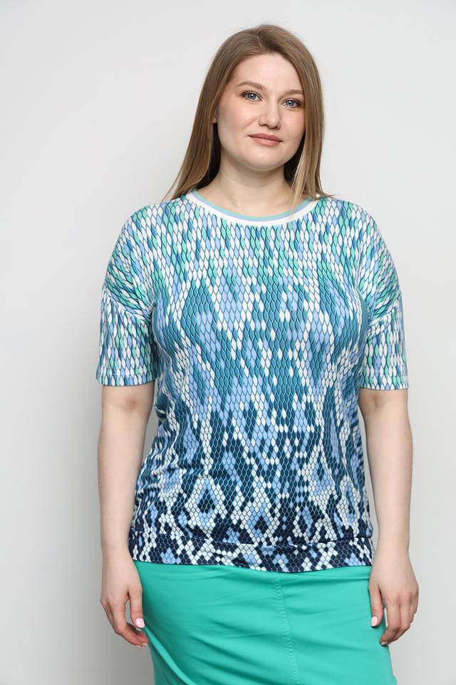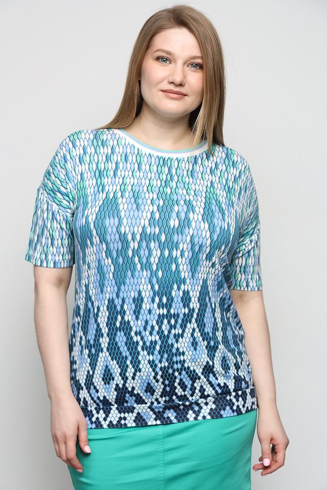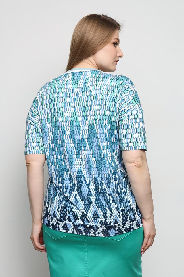 Женская футболка Olsen бирюзового цвета с оригинальным геометрическим принтом. Модель выполнена из мягкой вискозы с добавлением эластана, обеспечивающего комфортную посадку по фигуре. Состав: вискоза 97%, эластан 3%