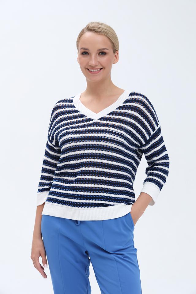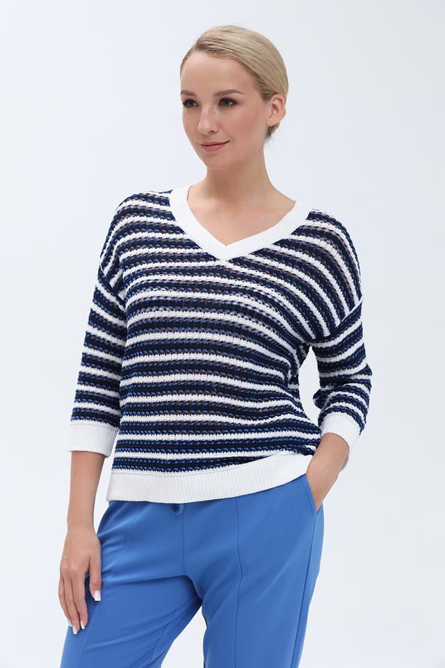 Женский пуловер Olsen синего и белого цвета с V-образным вырезом и короткими рукавами. Модель выполнена в классической полосатой расцветке и станет отличным дополнением к вашему гардеробу. Состав: хлопок 78%, лен 22%