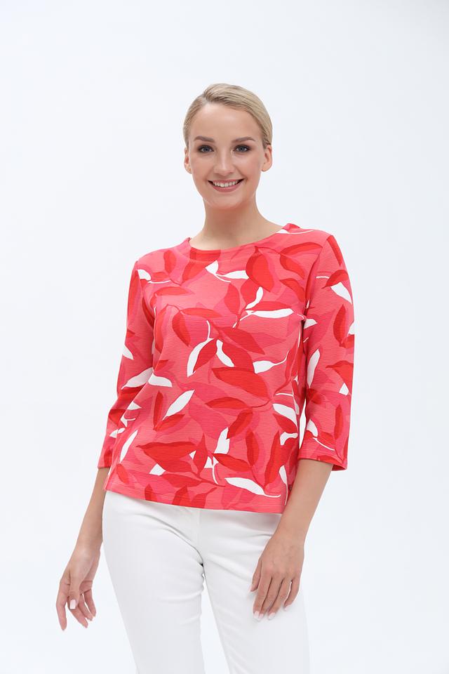 Этот женский пуловер от бренда Olsen выполнен в ярком коралловом цвете и украшен оригинальным цветочным принтом. Модель имеет округлый вырез горловины и удобный рукав три четверти, что делает его универсальным для различных образов.