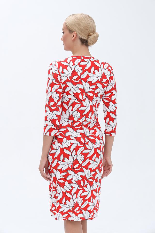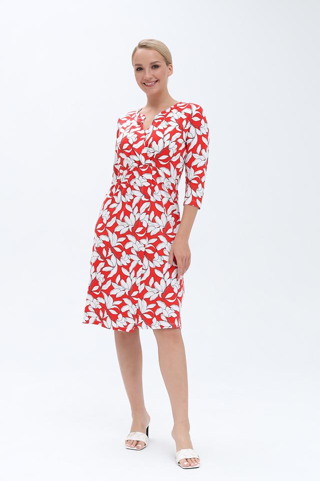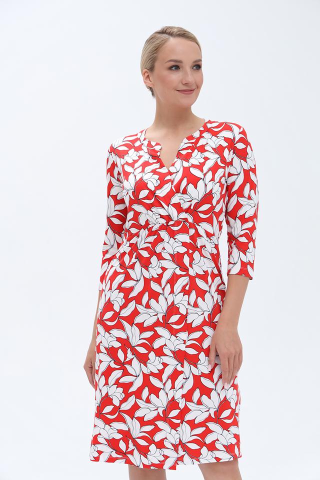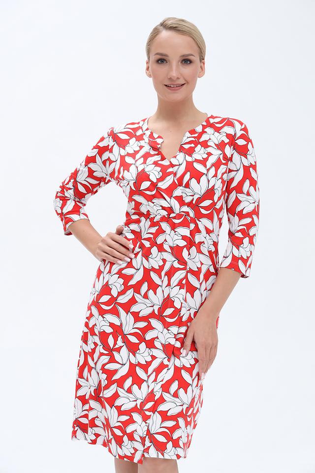 Это стильное платье от бренда Olsen станет прекрасным дополнением вашего гардероба. Платье выполнено в яркой цветовой гамме – сочетание красного и белого создает эффектный цветочный принт.