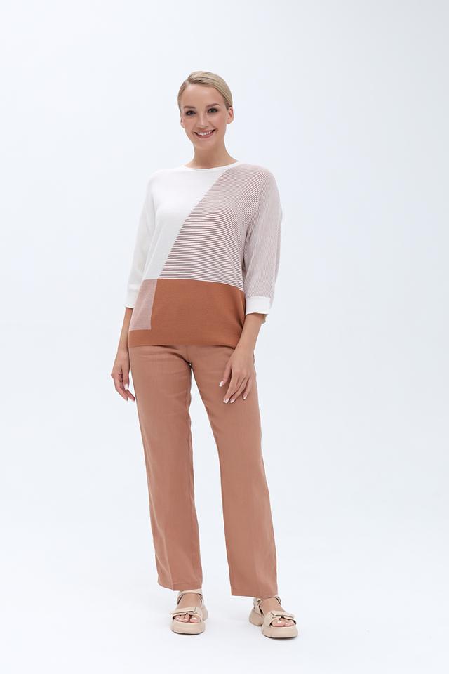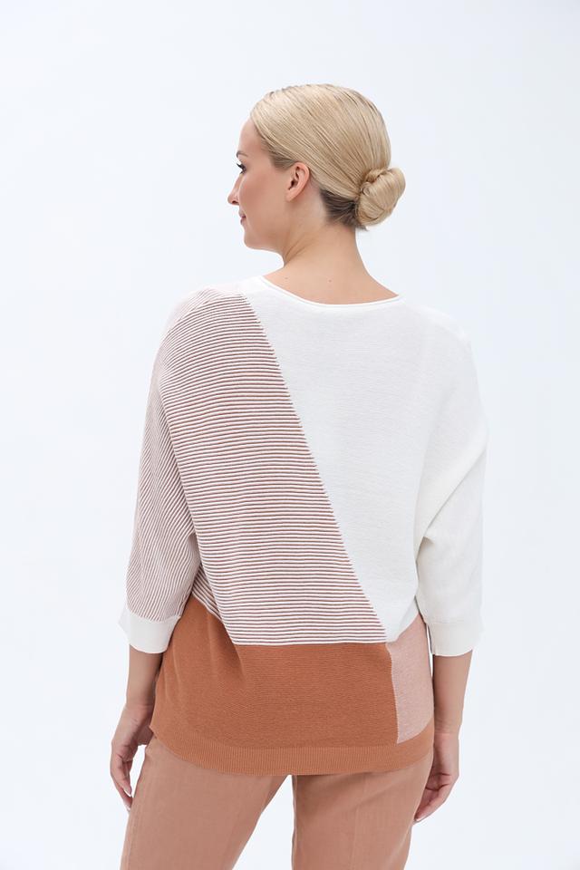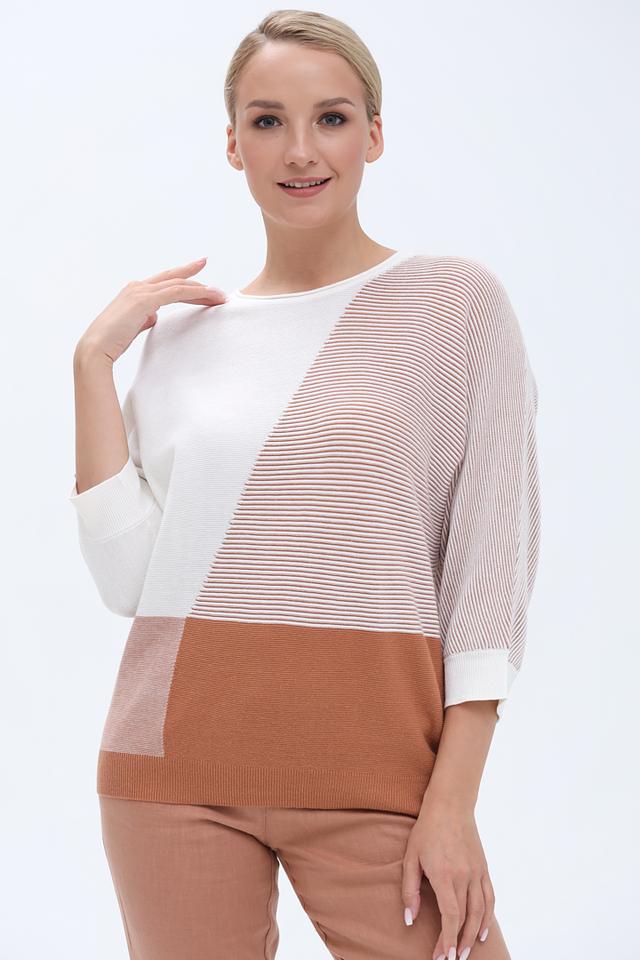 Пуловер имеет свободный крой и короткие рукава, что делает его идеальным для создания повседневных образов. Особенностью модели является асимметричный дизайн с полосками и сочетание нескольких оттенков бежевого и белого.