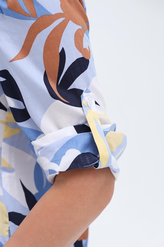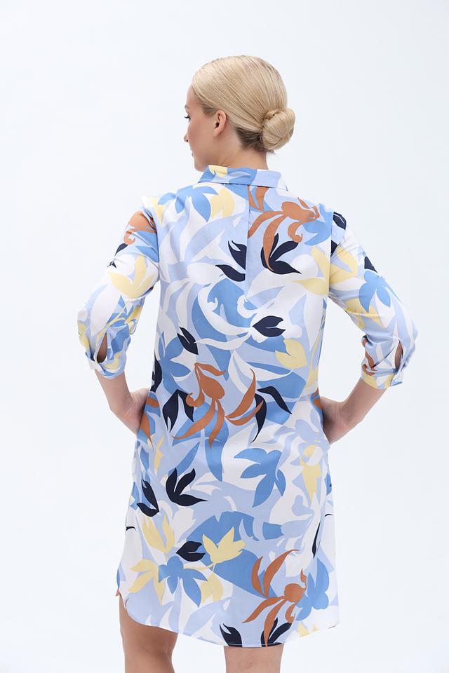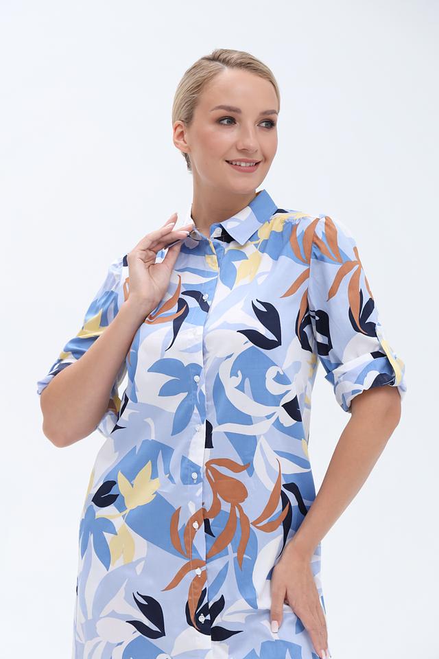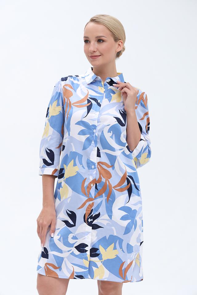 Платье имеет прямой силуэт, воротник рубашка и рукава три четверти. Застежка на пуговицах по всей длине платья. Яркий цветочный принт добавляет образу женственности и легкости.
