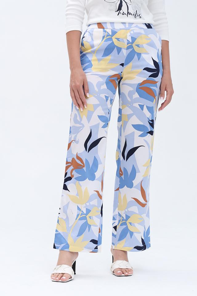 Особенностью модели является оригинальный цветочный принт, сочетающий в себе оттенки голубого, жёлтого и коричневого. Прямой крой брюк обеспечивает свободу движений и подходит для различных типов фигуры.