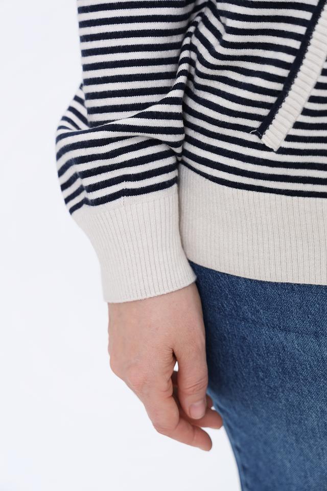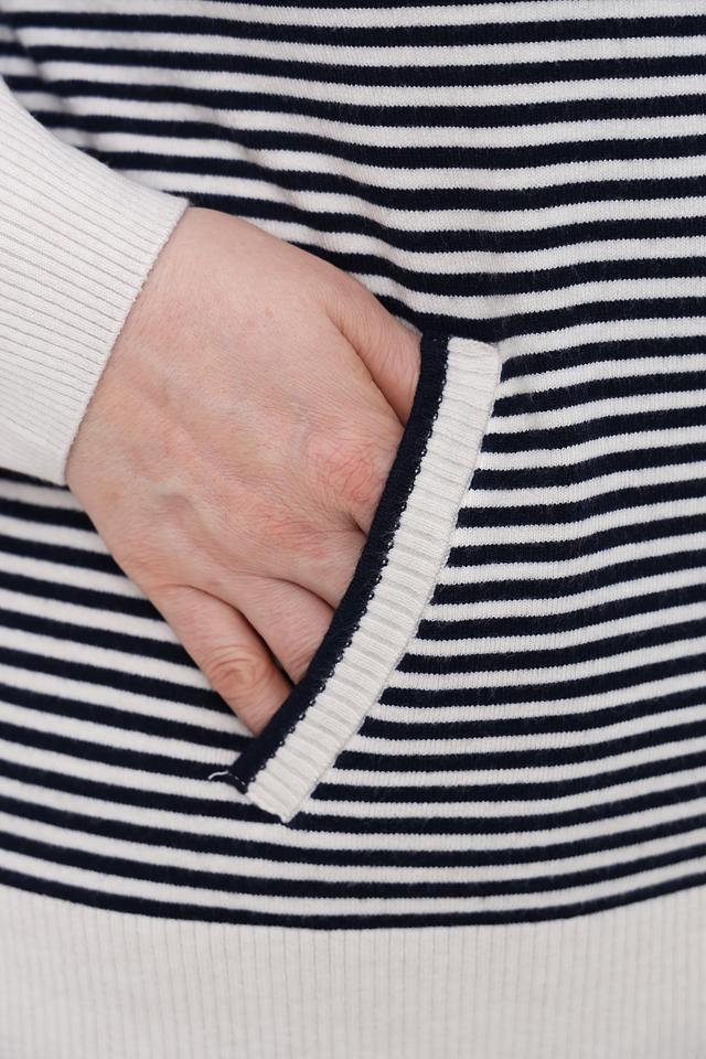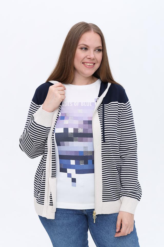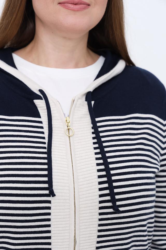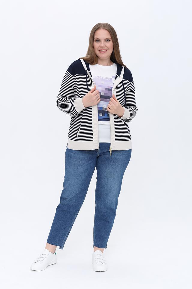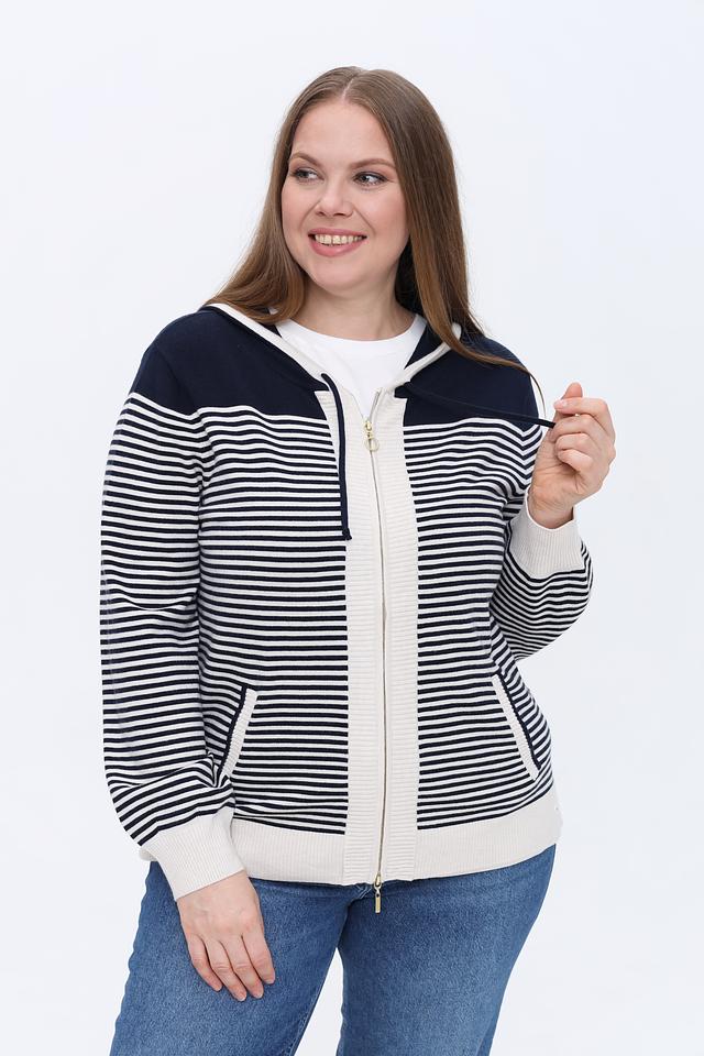 Жакет Olsen в полоску сине-белого цвета с капюшоном и застежкой-молнией. Модель выполнена из мягкого трикотажа и дополнена удобными карманами. Идеальный выбор для создания комфортного и стильного образа. Состав: вискоза 50%, полиамид 27%, полиэстер 23%