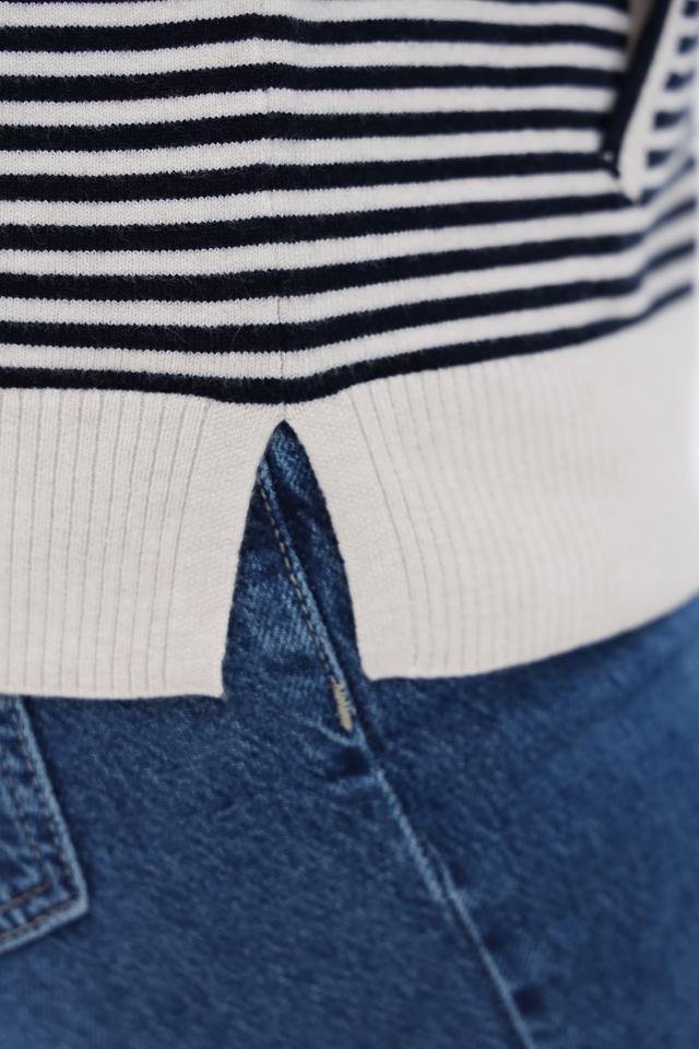 Этот жакет от Olsen станет отличным дополнением к вашему гардеробу. Модель выполнена в классической полосатой расцветке – сочетание белого и синего цветов выглядит свежо и универсально.