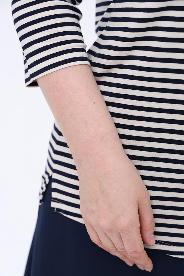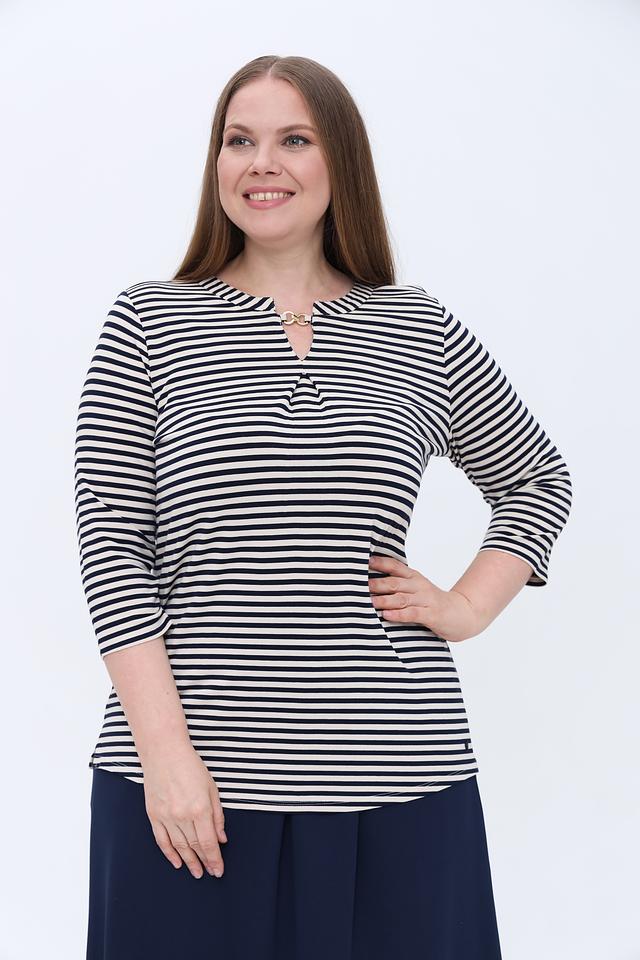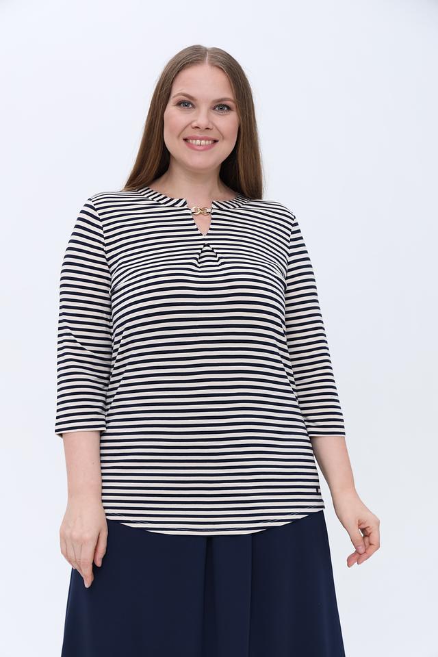 Лонгслив Olsen белого и чёрного цвета с полоской и V-образным вырезом, украшенным небольшой золотистой цепочкой. Изготовлен из мягкой вискозы с добавлением эластана для комфортной посадки и свободы движений. Состав: вискоза 97%, эластан 3%