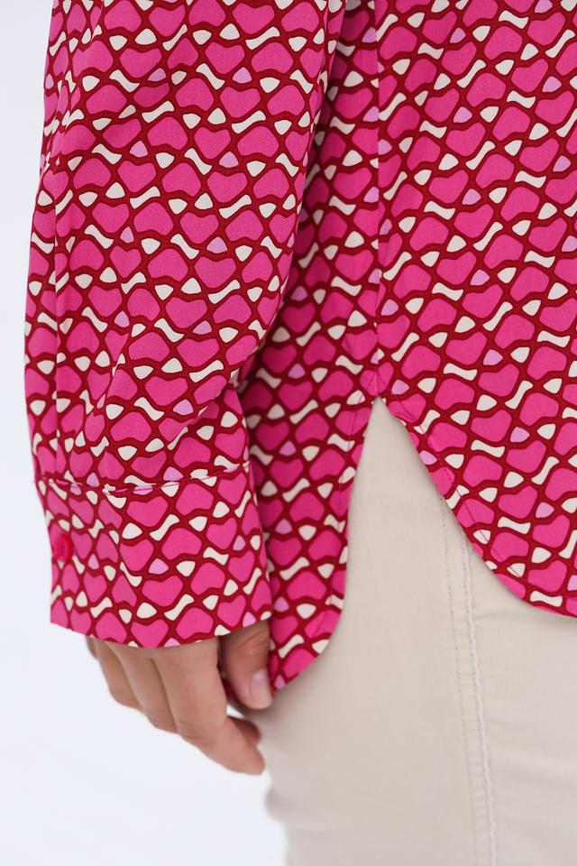Эта стильная рубашка от бренда Olsen станет ярким акцентом вашего гардероба. Выполнена в насыщенном фуксиевом цвете с оригинальным геометрическим принтом, который придает ей неповторимый вид.