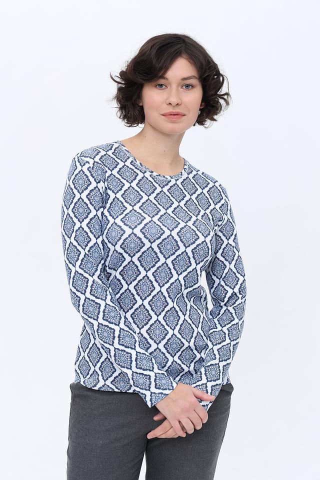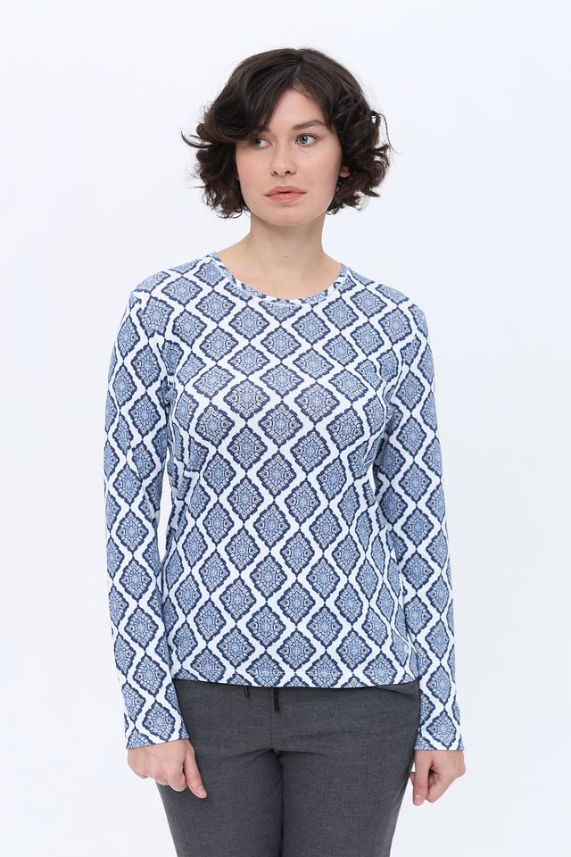 Лонгслив имеет прямой крой и круглый вырез горловины. Его особенностью является яркий геометрический принт в голубых и белых тонах, который придаёт изделию оригинальность и выразительность.