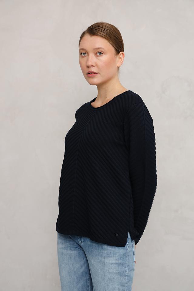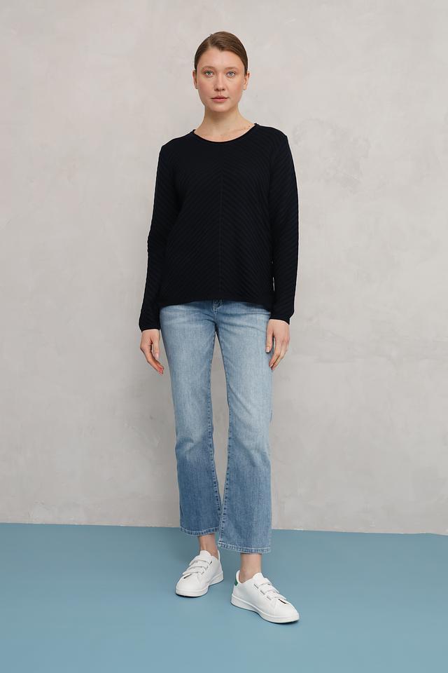 Особенностью модели является выразительная текстура, создающая визуальный интерес и добавляющая объём. Пуловер имеет круглый вырез горловины и длинные рукава, обеспечивающие тепло и уют.
