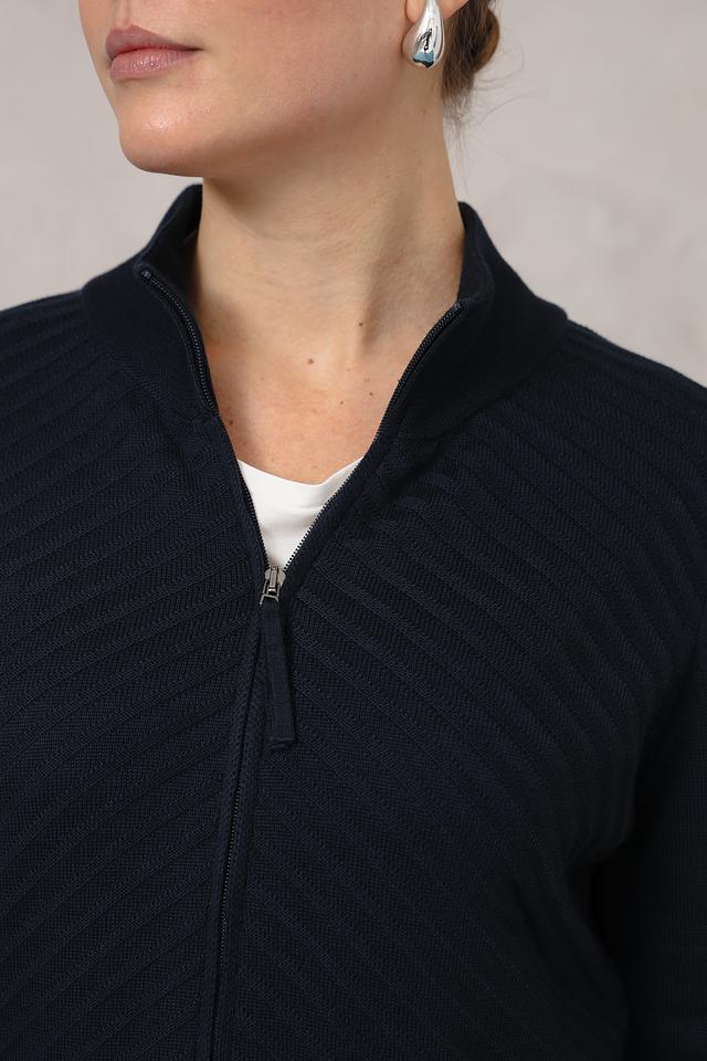 Особенности: стеганая фактура, удобная застежка-молния, практичные накладные карманы, универсальный тёмно-синий цвет.