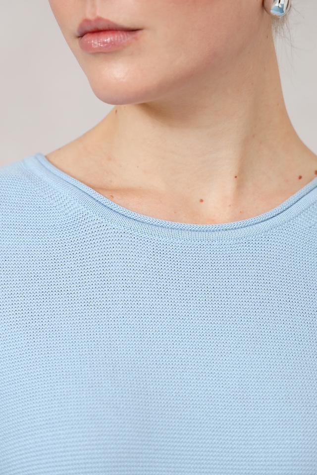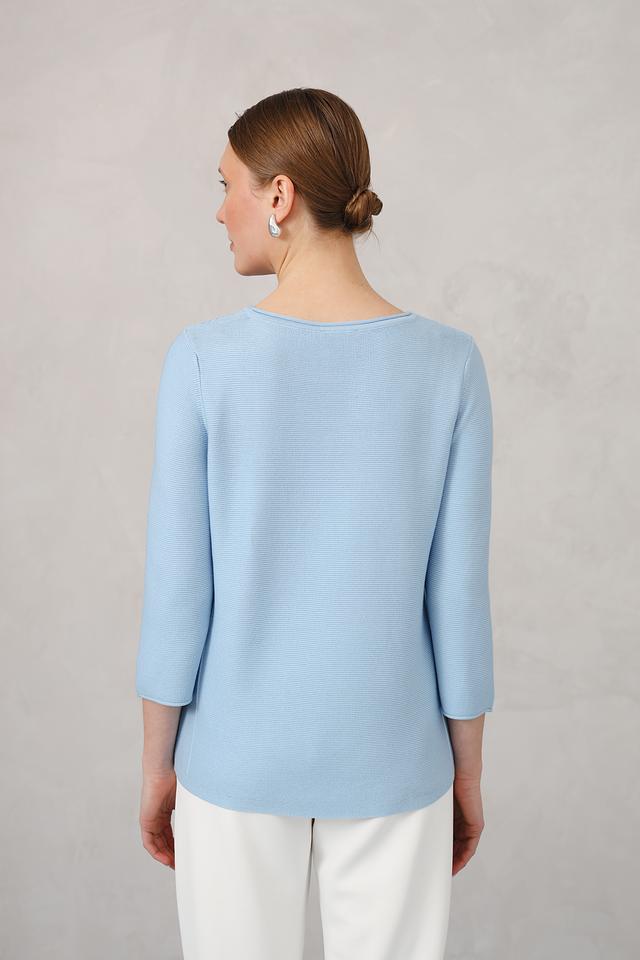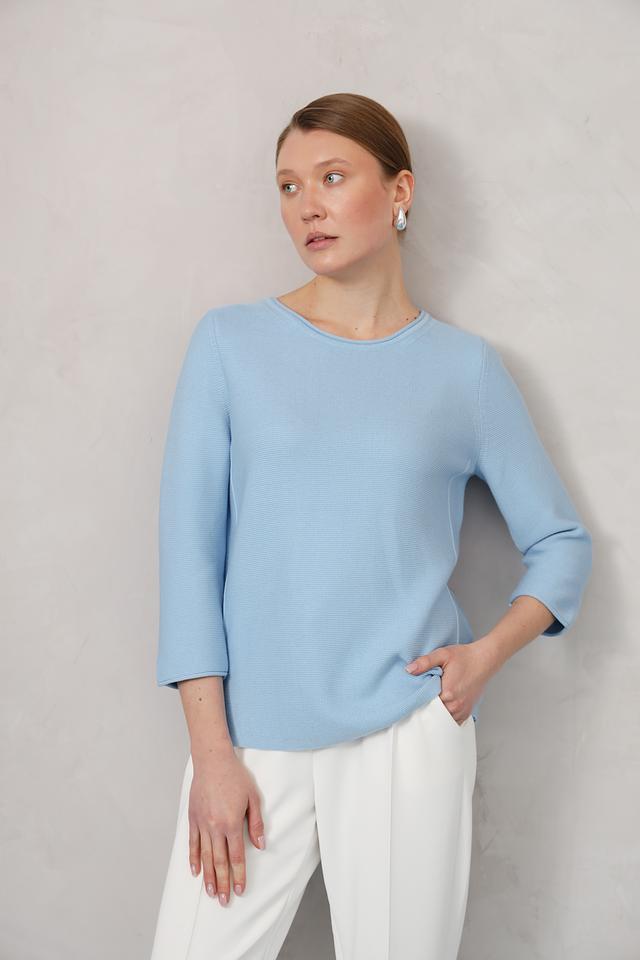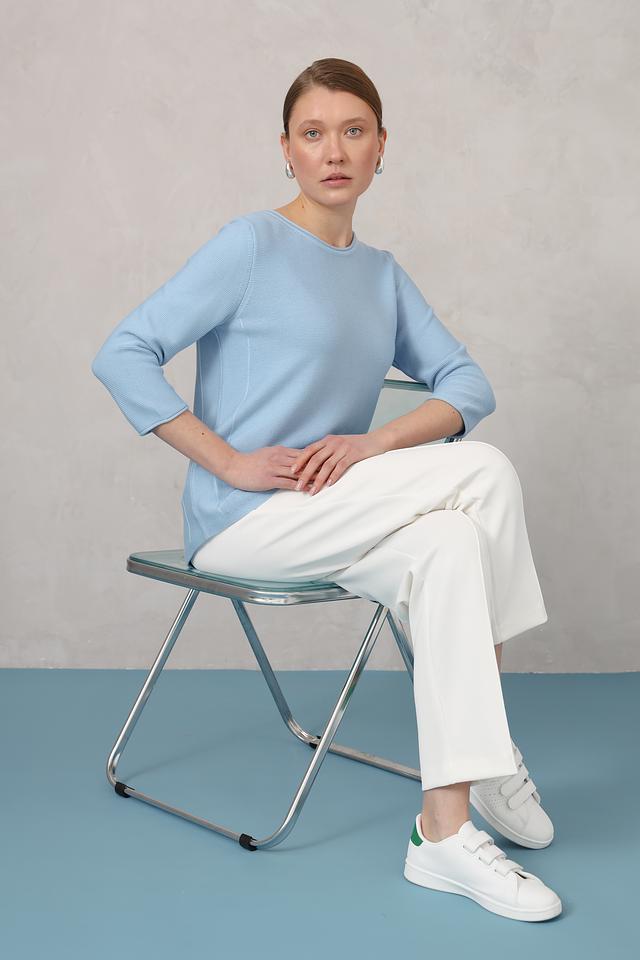 Пуловер имеет классический голубой цвет и лаконичный дизайн. Округлый вырез горловины и рукав три четверти делают его универсальным для создания различных образов. Слегка приталенный силуэт подчеркивает достоинства фигуры, не сковывая движений.