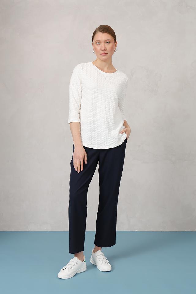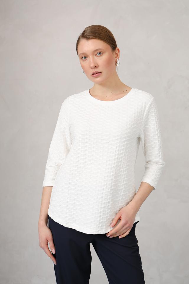 Этот стильный пуловер от Olsen выполнен в белом цвете и отличается оригинальной текстурой, создающей объёмный эффект. Модель имеет круглый вырез горловины и рукава длиной три четверти, что делает её универсальной для различных образов.