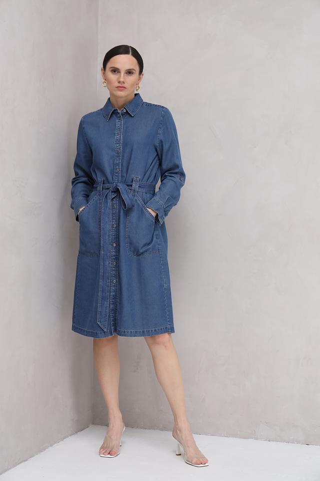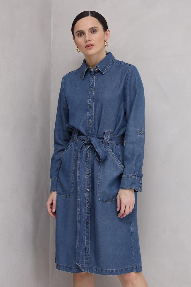 Платье рубашка от Olsen выполнено в денимовом стиле голубого цвета. Модель с длинным рукавом и поясом, завязывающимся на талии, подчеркнет фигуру и создаст стильный образ. Состав: лиоцел 100%
