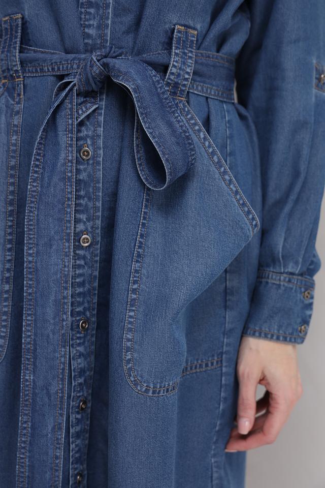 Модель имеет прямой крой, длинные рукава и воротник рубашечного типа. Платье застегивается на пуговицы по всей длине, что позволяет регулировать степень открытости. Пояс в комплекте помогает подчеркнуть талию и создать более женственный силуэт.