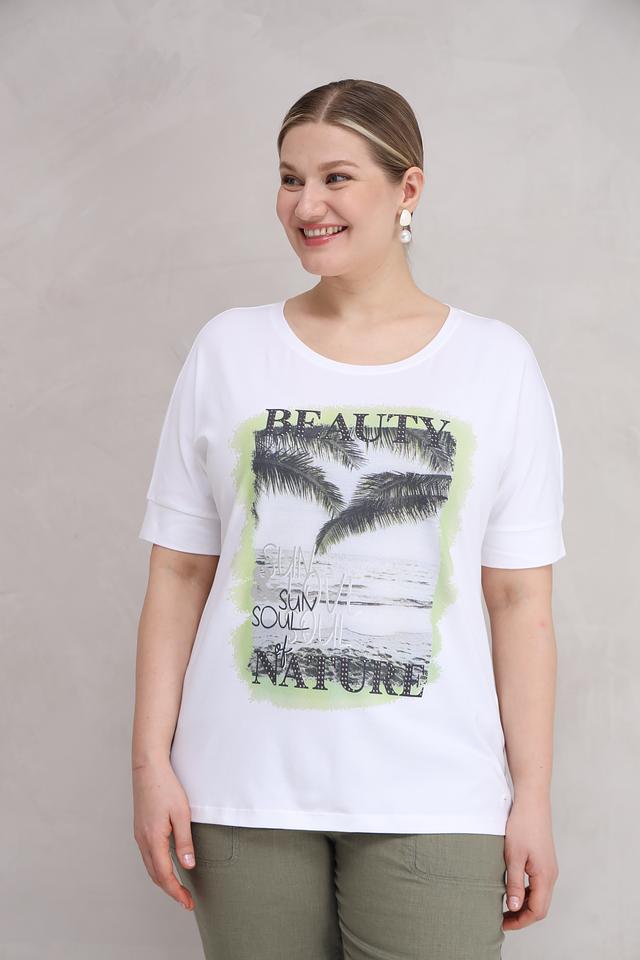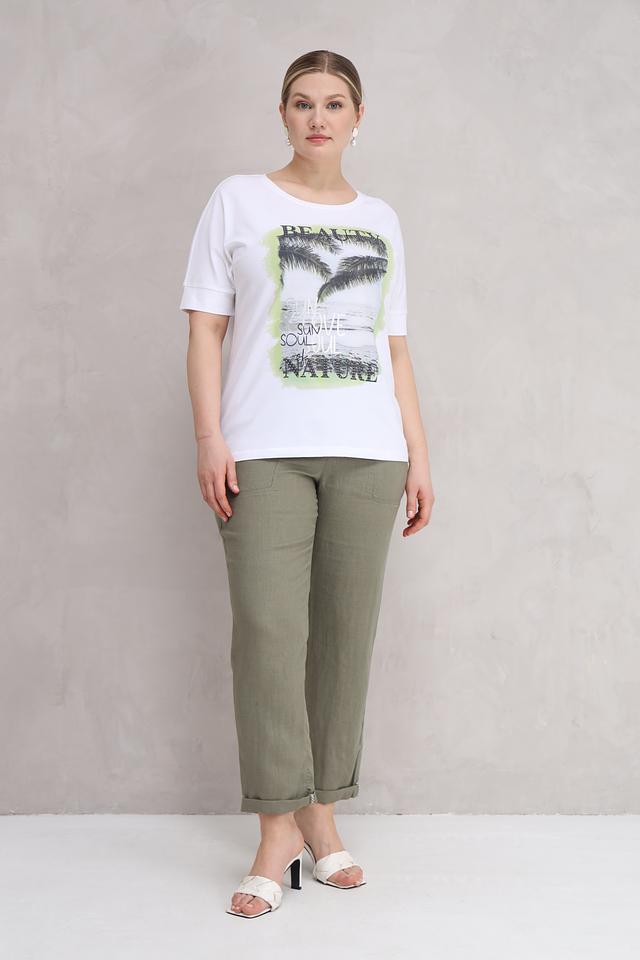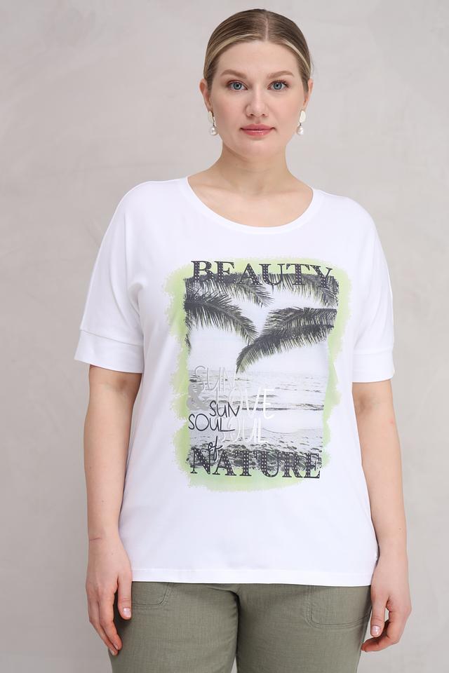 Белая футболка Olsen с ярким принтом в виде пальм и надписей. Изготовлена из мягкого хлопка с добавлением эластана для комфорта и свободы движений. Отличный выбор для создания повседневного образа. Состав: хлопок 95%, эластан 5%