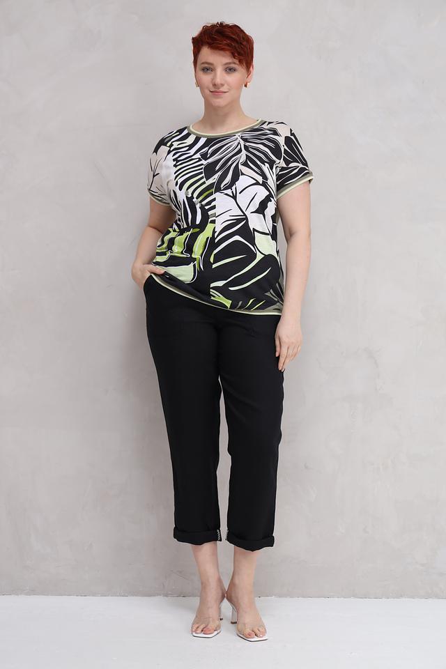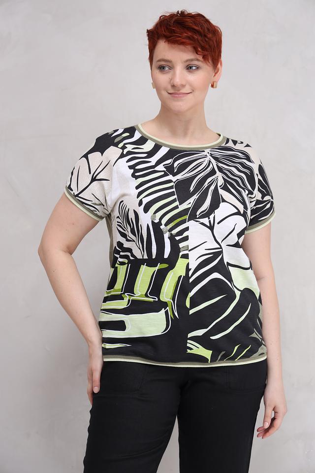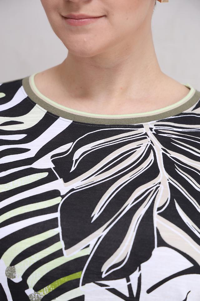 Основной цвет блузы – хаки, но ее украшает эффектный принт с изображением тропических листьев, выполненный в оттенках зеленого, белого и черного. Вырез горловины – округлый, а короткие рукава делают блузу идеальной для теплой погоды.