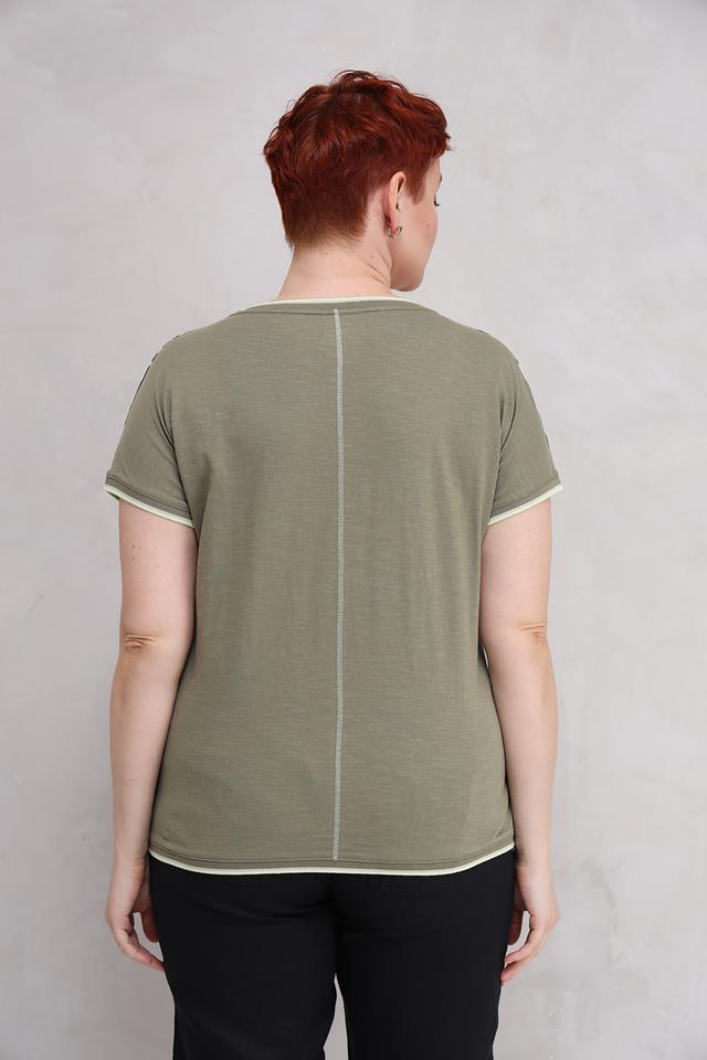 Особенностью данной модели является контрастная отделка горловины и рукавов светлым лаймовым цветом, что добавляет ей свежести и оригинальности. Блуза отлично сочетается с брюками, юбками и джинсами, позволяя создавать разнообразные стильные образы.