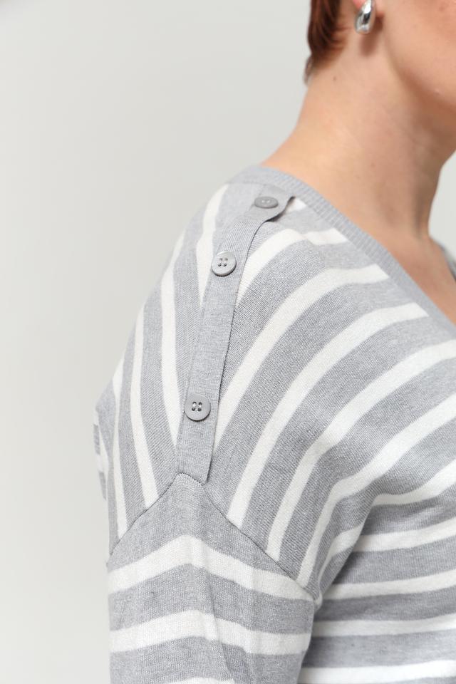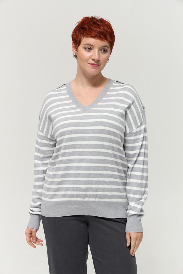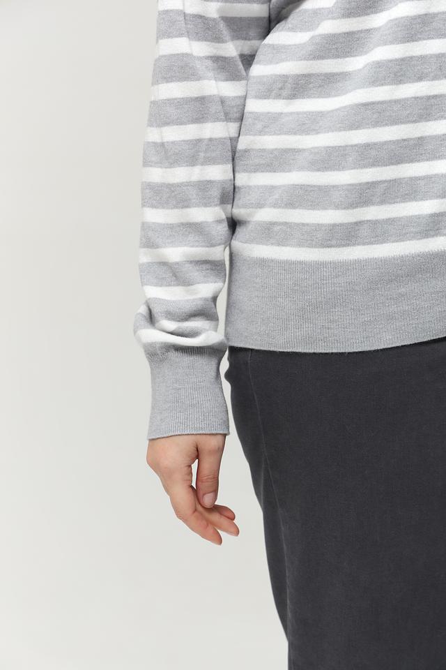 Этот пуловер от Olsen выполнен в классическом стиле с полосатым узором. Преобладающий цвет – серый, что делает его универсальным элементом гардероба, легко сочетаемым с различными вещами.