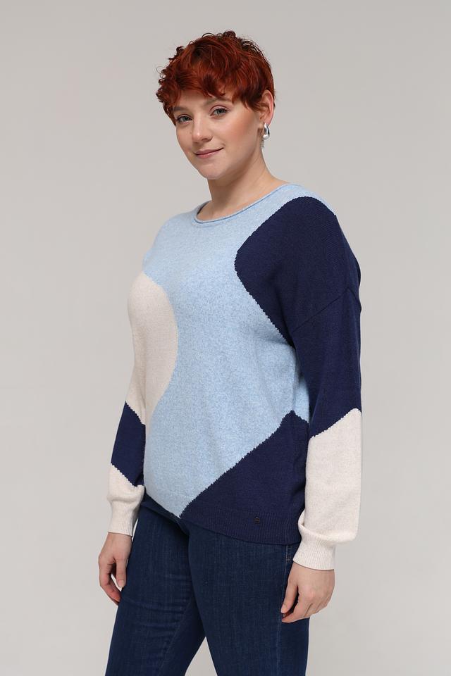 Этот стильный пуловер от бренда Olsen станет прекрасным выбором для создания уютного и модного образа. Пуловер выполнен в сочетании голубого, бежевого и тёмно-синего цветов с геометрическим рисунком, который придает ему оригинальность.