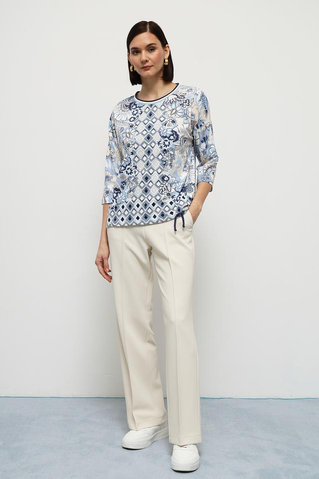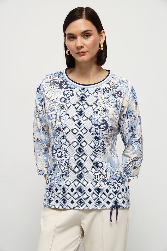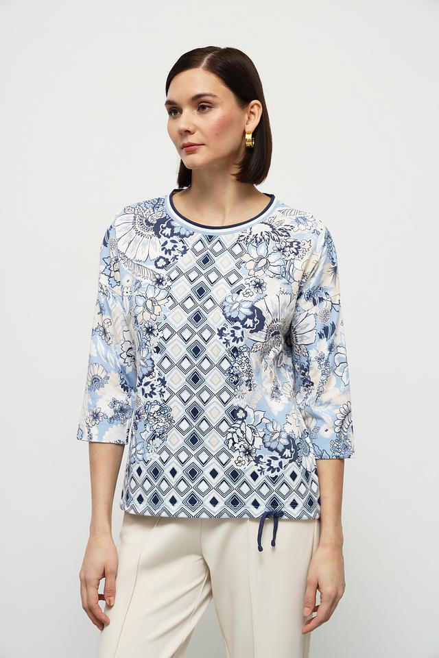 Блуза имеет прямой крой, короткие рукава и круглый вырез горловины. Главной особенностью модели является яркий и необычный принт, сочетающий в себе геометрические фигуры и цветочные мотивы в голубой гамме. Декоративная завязка по низу изделия добавляет образу легкости и непринужденности.