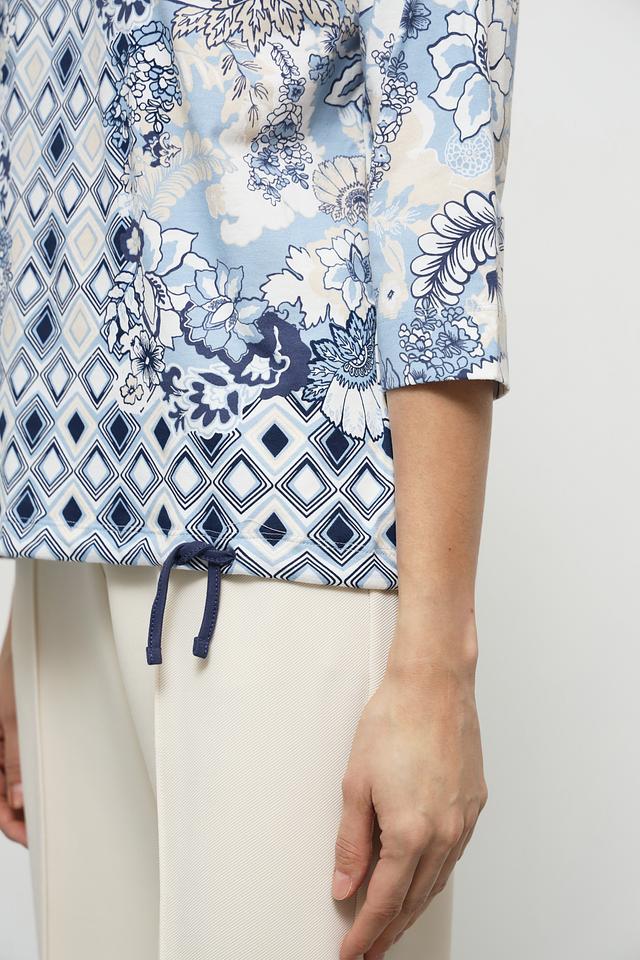 Блуза Olsen голубого цвета с оригинальным геометрическим и цветочным принтом. Модель выполнена из мягкого хлопка с добавлением эластана, что обеспечивает комфорт в носке и хорошую посадку по фигуре. Состав: хлопок 95%, эластан 5%