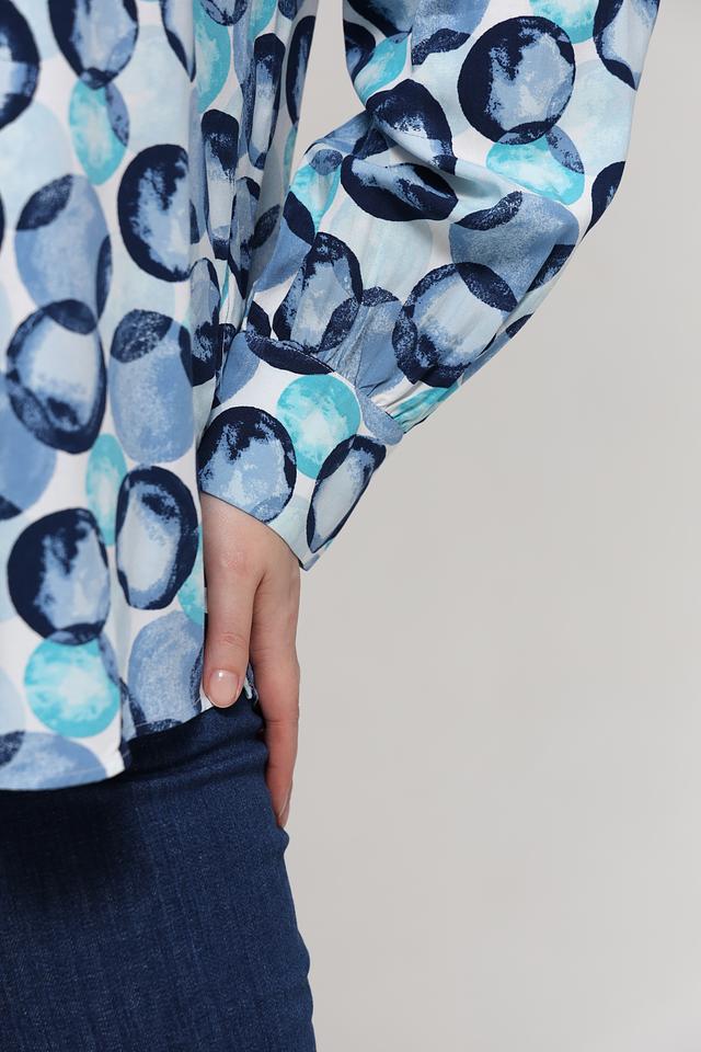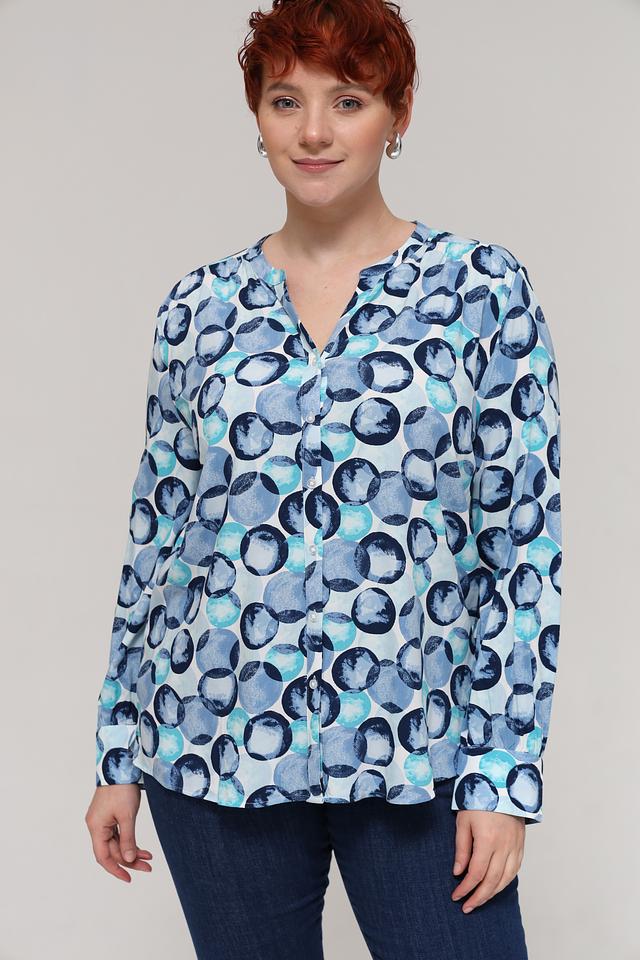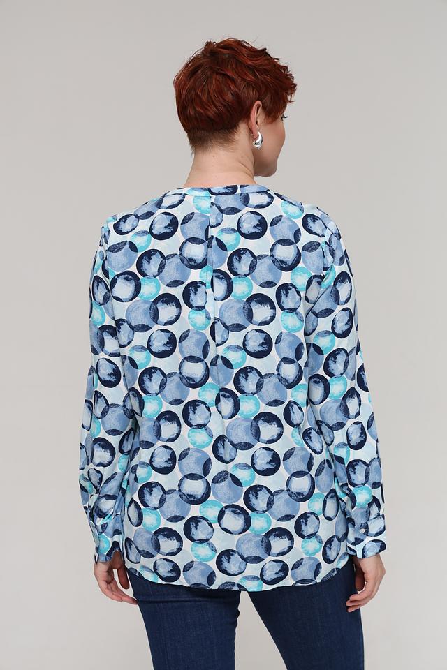 Особенностью данной модели является яркий и запоминающийся принт, состоящий из окружностей различных оттенков голубого и синего. V-образный вырез горловины и длинные рукава придают блузе классический вид. Свободный крой обеспечивает комфортную посадку по фигуре.