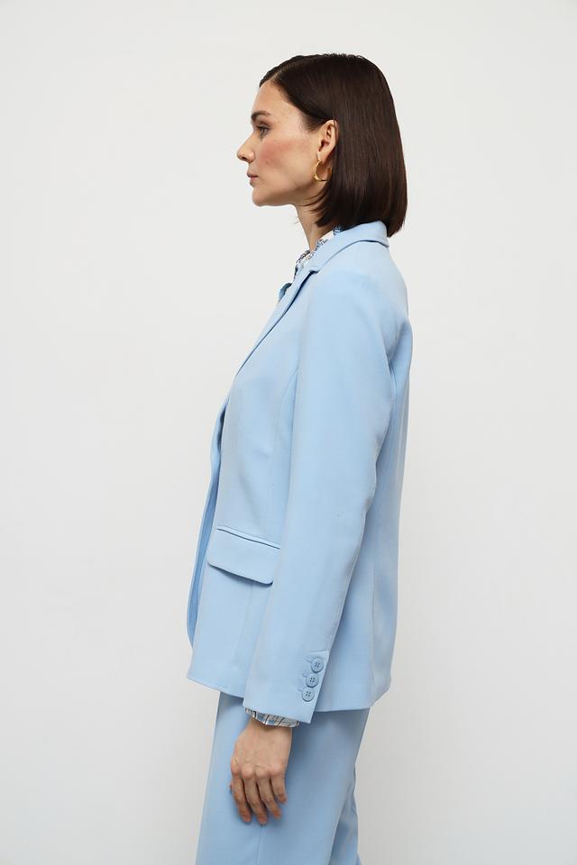 Жакет имеет приталенный силуэт, который подчеркивает фигуру. Классический лацкан и застежка на одну пуговицу придают модели лаконичный и утонченный вид. Длинные рукава с аккуратными манжетами дополняют образ.