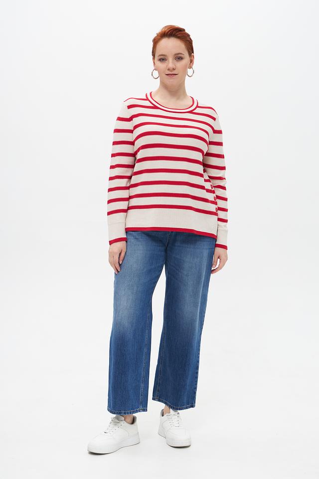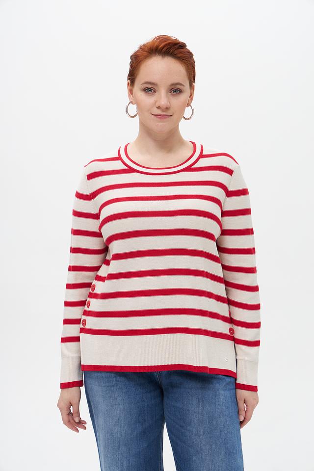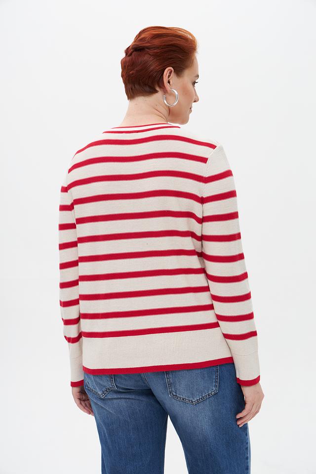 Женский пуловер от бренда Olsen выполнен в классическом стиле с полосатым узором. Преобладающий цвет – бежевый, полосы – красные. Модель имеет круглый вырез горловины и длинные рукава.