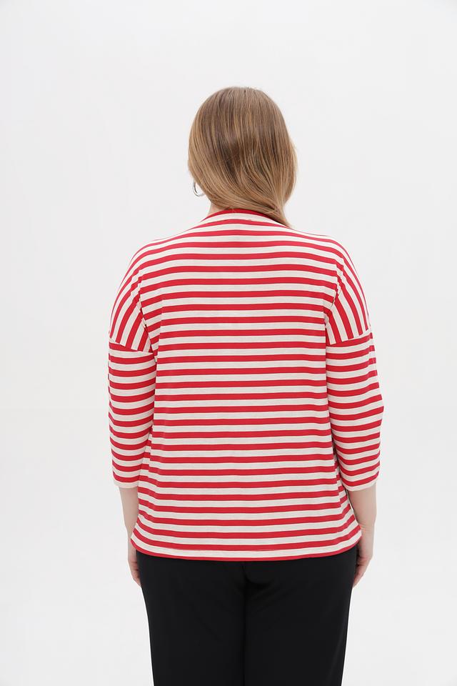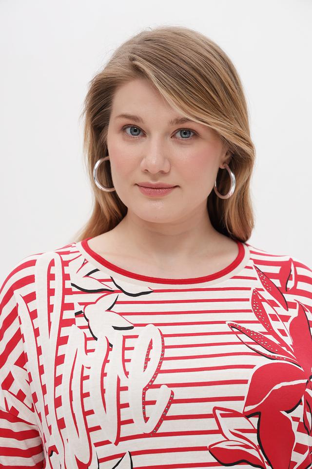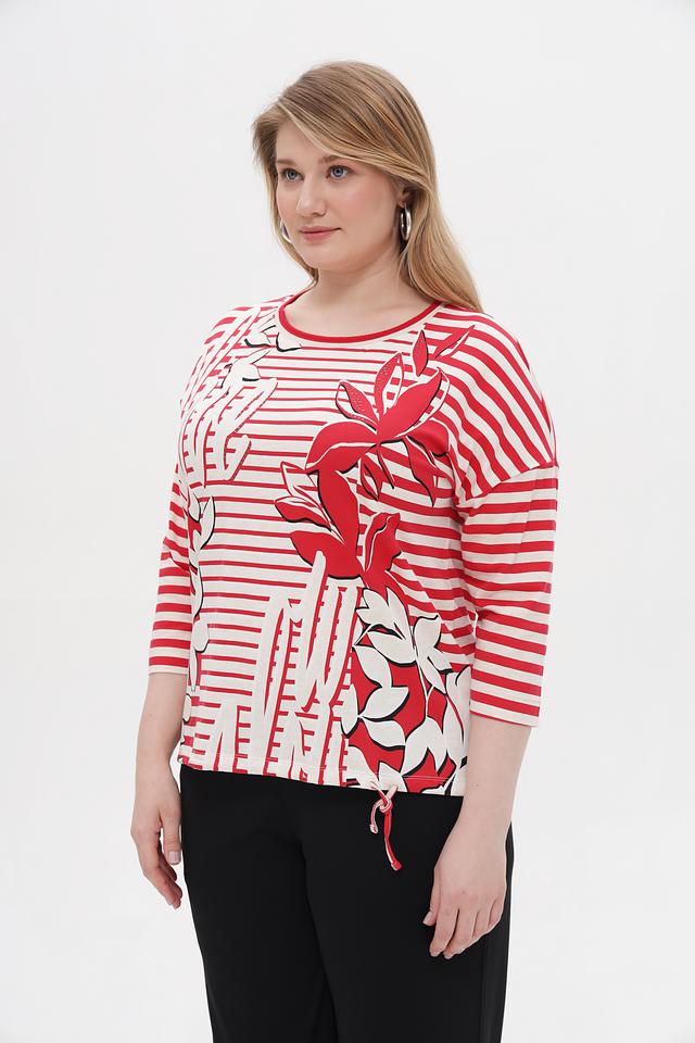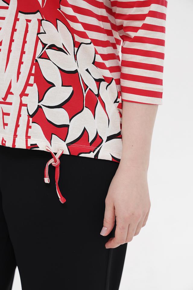 Блуза имеет яркий цветочный принт на фоне красных и белых полосок. Округлый вырез горловины и рукава 3/4 делают ее универсальной для различных образов. Сбоку блузы предусмотрена небольшая кулиска с завязками, которая позволяет регулировать силуэт.
