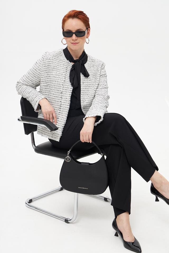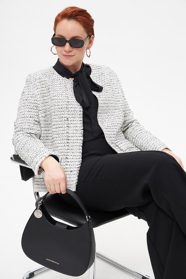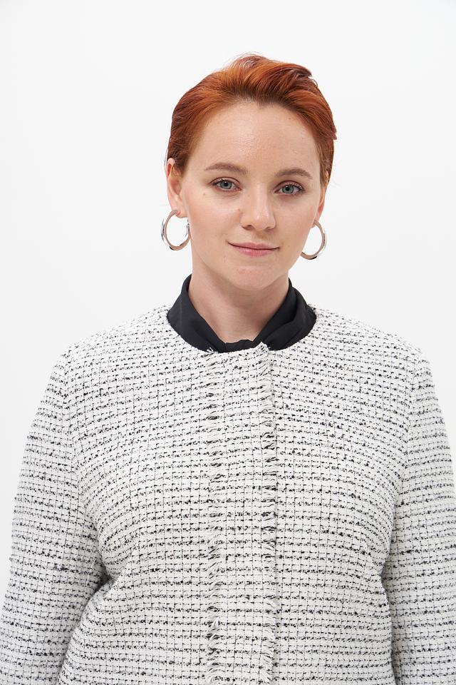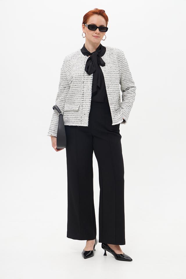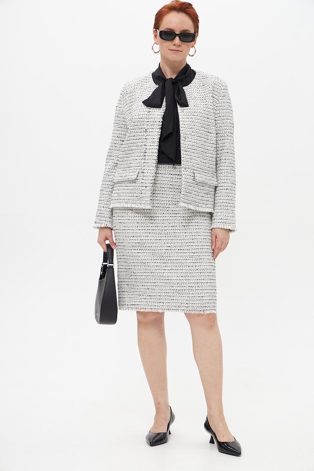 Состав ткани включает полиэстер, хлопок, вискозу и небольшое количество эластана, что обеспечивает комфорт в носке, хорошую посадку и устойчивость к сминанию. Жакет идеально сочетается с юбками, брюками и платьями, создавая стильные и элегантные образы.