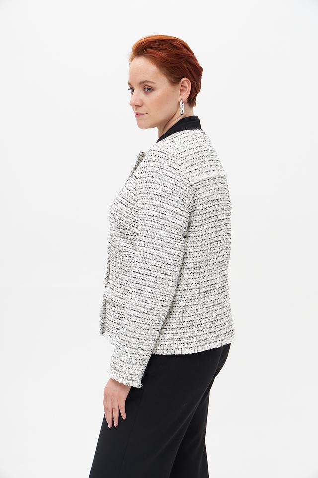Жакет имеет приталенный силуэт, который подчеркивает фигуру. Застежка на пуговицы позволяет регулировать степень прилегания. Отделка бахромой по низу добавляет оригинальности.