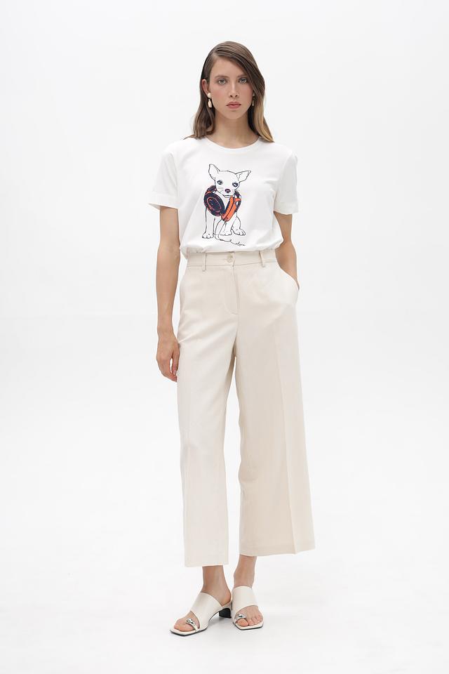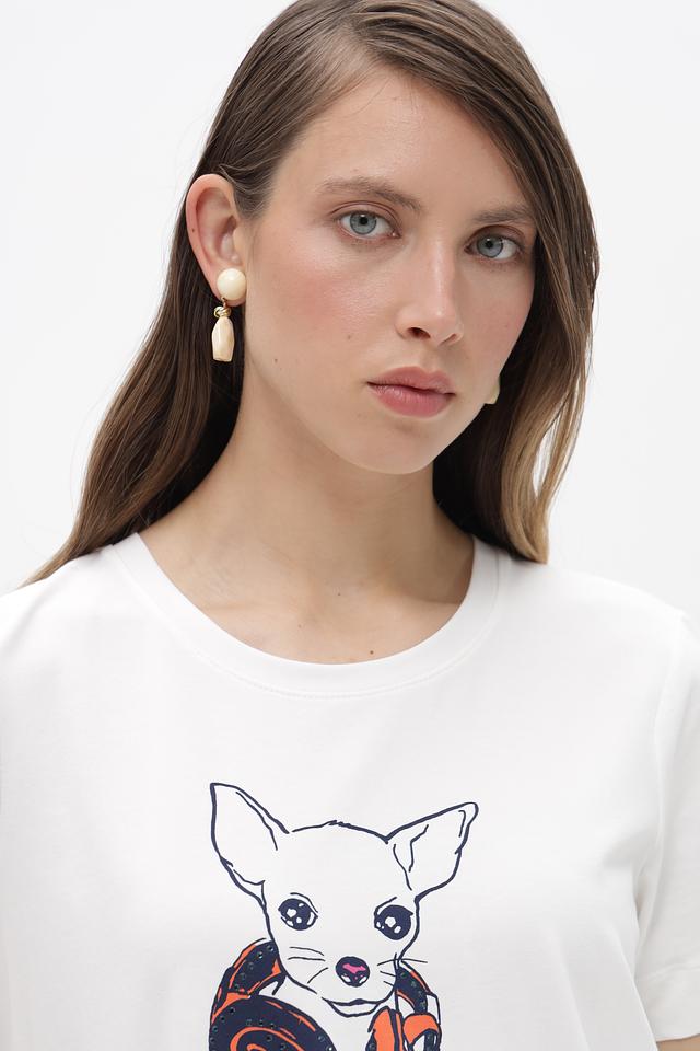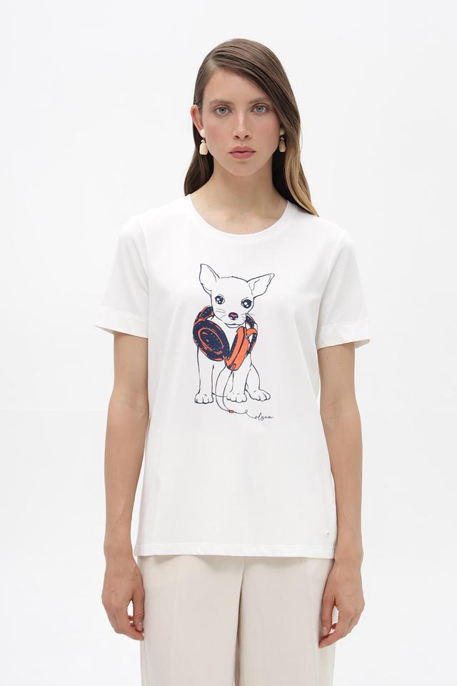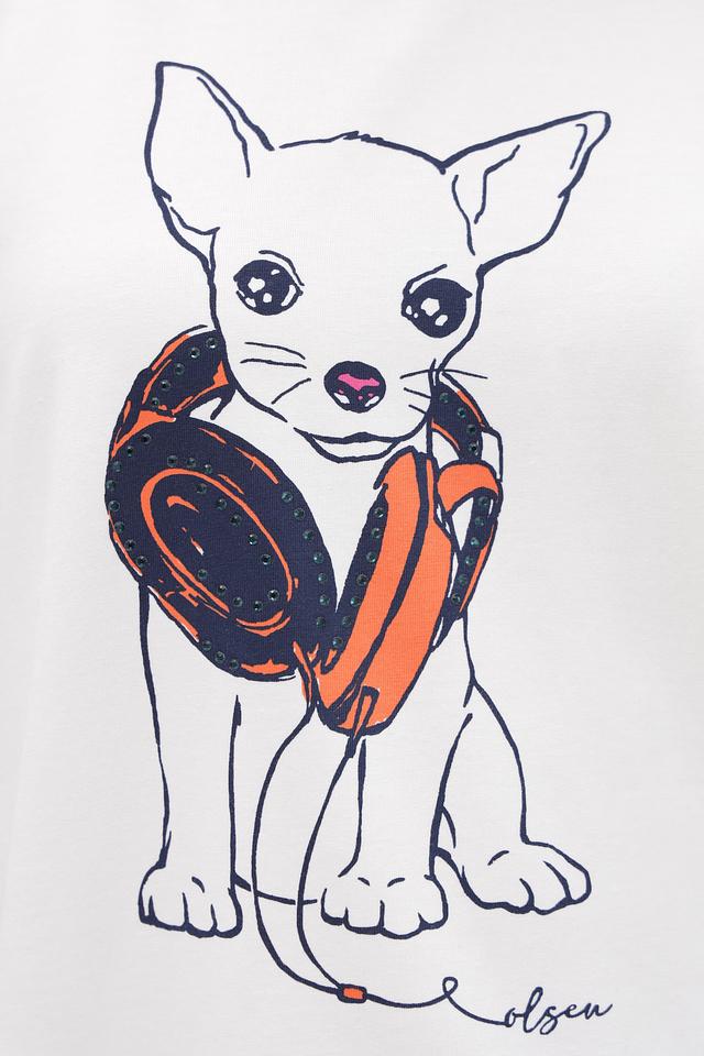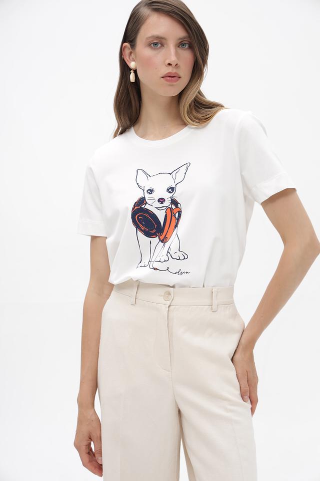 Белая футболка от Olsen с принтом в виде чихуахуа станет ярким акцентом в вашем образе. Изготовлена из мягкого хлопка с добавлением эластана для комфортной посадки. Состав: хлопок 95%, эластан 5%