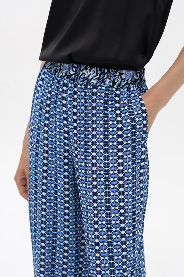 Представляем стильные брюки от бренда Olsen, выполненные в приятной синей цветовой гамме с ярким геометрическим принтом. Модель отличается свободным кроем и широкими штанинами, что обеспечивает максимальный комфорт и свободу движений.
