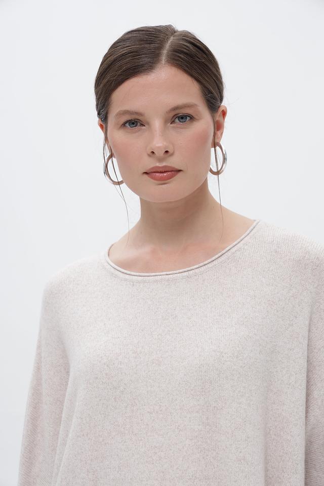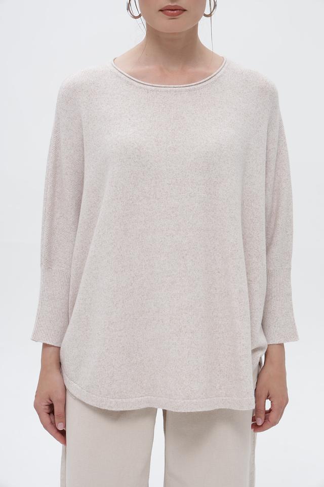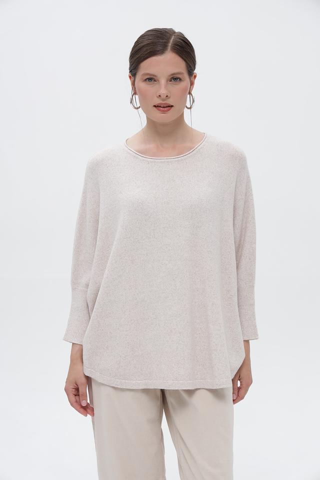 Округлый вырез горловины аккуратно обработан и дополнен контрастной окантовкой, что придает изделию изысканность. Рукава ¾ делают этот пуловер универсальным для любого времени года.