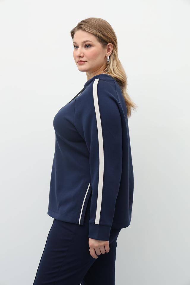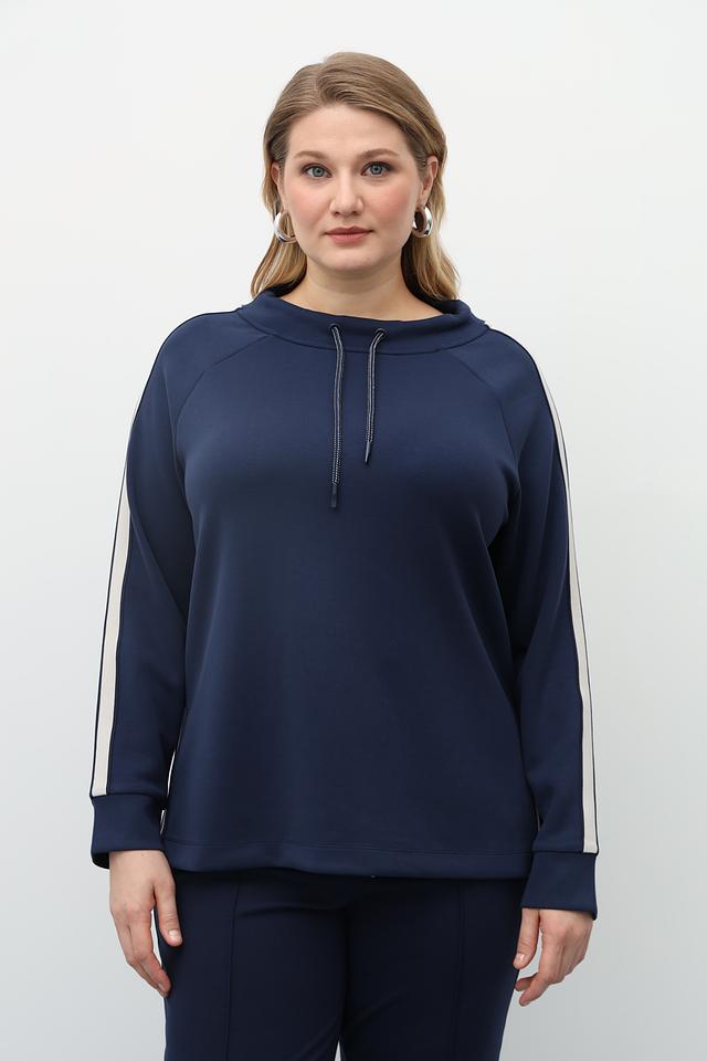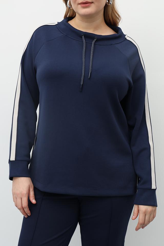 Пуловер имеет свободный крой, что позволяет чувствовать себя свободно и непринужденно. Декоративные белые полосы по бокам добавляют динамичности и спортивного шика. Модель дополнена капюшоном со шнурком для удобства регулировки.