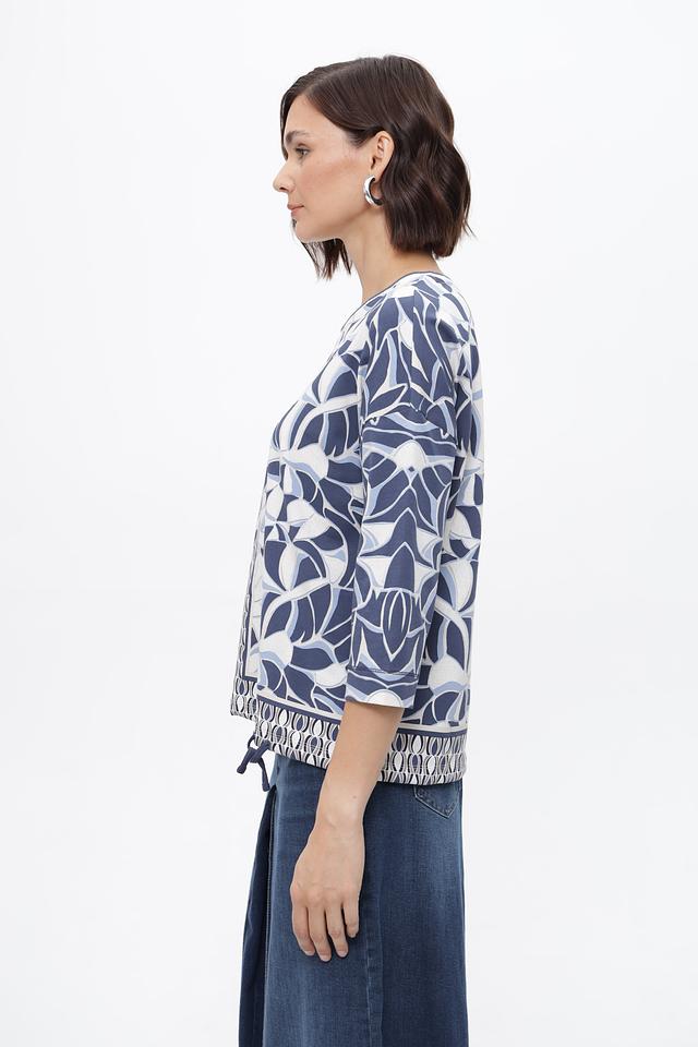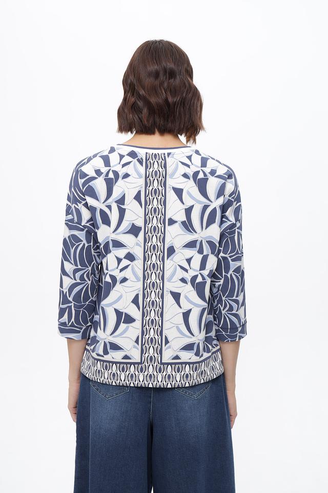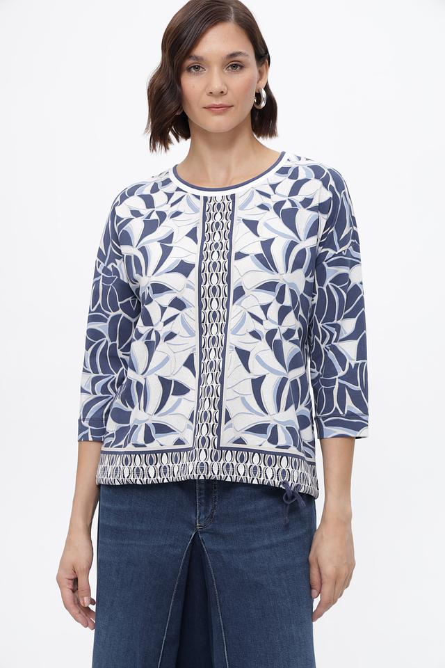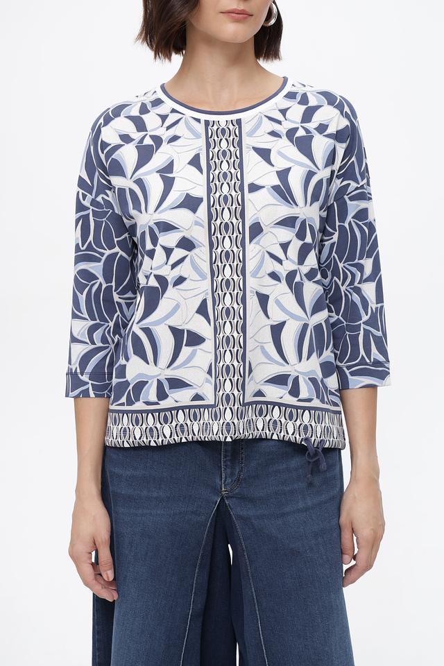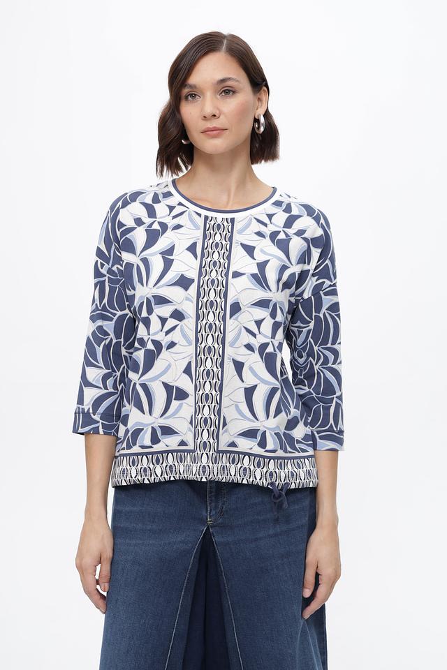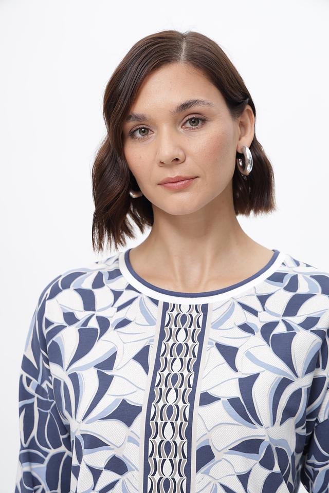 Блуза имеет прямой крой и короткий рукав 3/4, что делает ее универсальной для различных образов. Особенностью модели является яркий и запоминающийся цветочный принт в сине-белой гамме, который добавит свежести и оригинальности вашему стилю.