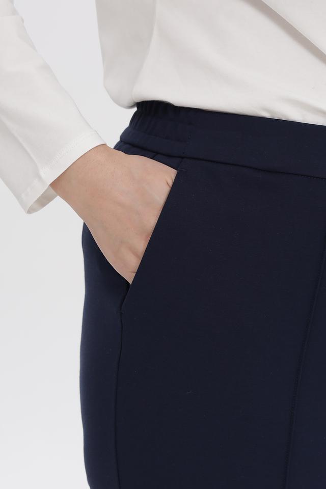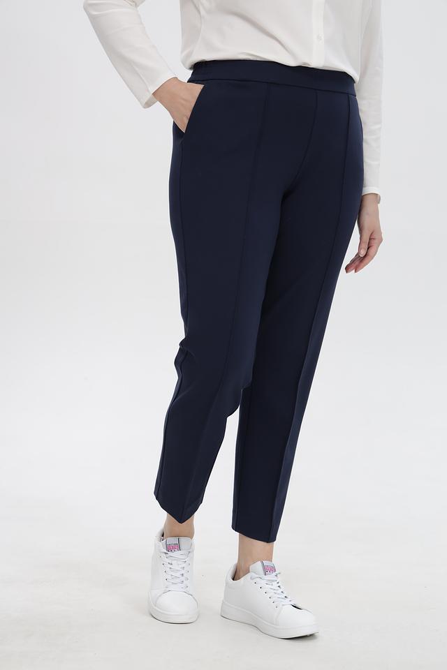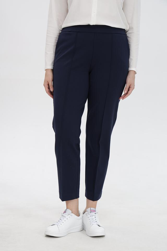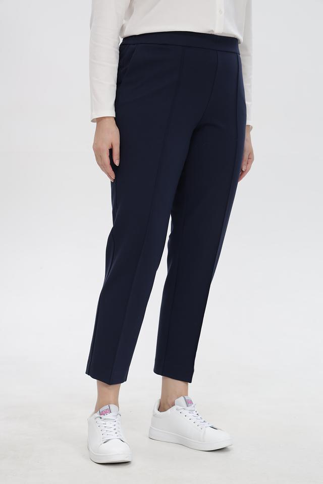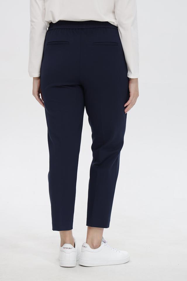Брюки имеют прямой крой и слегка зауженный книзу силуэт, что визуально удлиняет ноги и создает элегантный образ. Эластичный пояс обеспечивает удобную посадку по фигуре, не стесняя движений. На брюках предусмотрены боковые карманы.